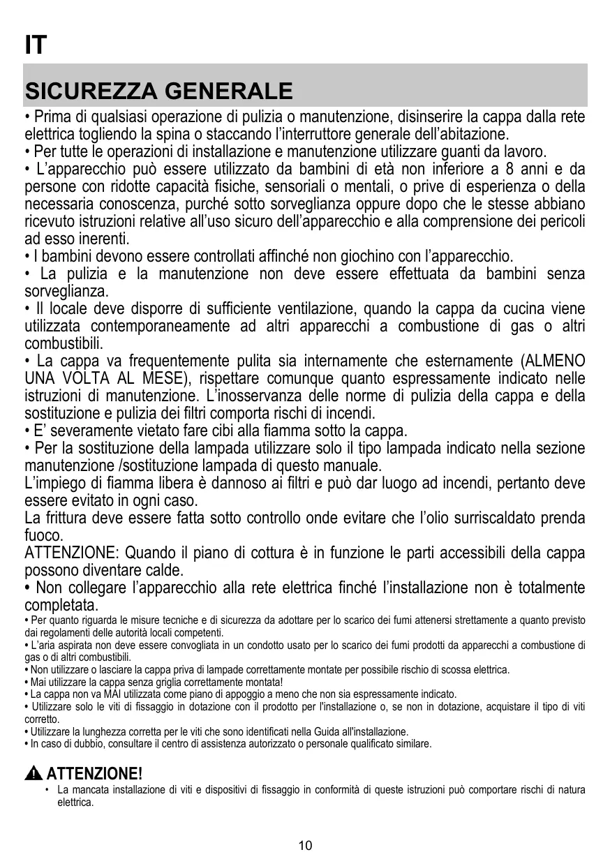 • Prima di qualsiasi operazione di pulizia o manutenzione, disinserire la cappa dalla rete elettrica togliendo la spina o staccando l’interruttore generale dell’abitazione. • Per tutte le operazioni di installazione e manutenzione utilizzare guanti da lavoro. • L’apparecchio può essere utilizzato da bambini di età non inferiore a 8 anni e da persone con ridotte capacità fisiche, sensoriali o mentali, o prive di esperienza o della necessaria conoscenza, purché sotto sorveglianza oppure dopo che le stesse abbiano ricevuto istruzioni relative all’uso sicuro dell’apparecchio e alla comprensione dei pericoli ad esso inerenti. • I bambini devono essere controllati affinché non giochino con l’apparecchio. • La pulizia e la manutenzione non deve essere effettuata da bambini senza sorveglianza. • Il locale deve disporre di sufficiente ventilazione, quando la cappa da cucina viene utilizzata contemporaneamente ad altri apparecchi a combustione di gas o altri combustibili. • La cappa va frequentemente pulita sia internamente che esternamente (ALMENO UNA VOLTA AL MESE), rispettare comunque quanto espressamente indicato nelle istruzioni di manutenzione. L’inosservanza delle norme di pulizia della cappa e della sostituzione e pulizia dei filtri comporta rischi di incendi. • E’ severamente vietato fare cibi alla fiamma sotto la cappa. • Per la sostituzione della lampada utilizzare solo il tipo lampada indicato nella sezione manutenzione /sostituzione lampada di questo manuale. L’impiego di fiamma libera è dannoso ai filtri e può dar luogo ad incendi, pertanto deve essere evitato in ogni caso. La frittura deve essere fatta sotto controllo onde evitare che l’olio surriscaldato prenda fuoco. ATTENZIONE: Quando il piano di cottura è in funzione le parti accessibili della cappa possono diventare calde. • Non collegare l’apparecchio alla rete elettrica finché l’installazione non è totalmente completata.