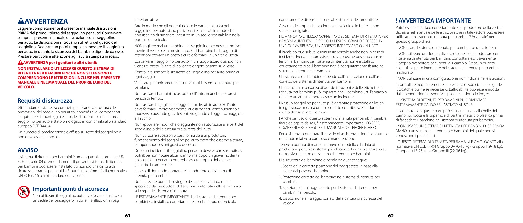 ! N'utilisez PAS le dispositif de retenue pour enfants sans la housse de siège. ! N'utilisez PAS la housse de siège d'un autre fabricant avec ce dispositif de retenue pour enfants. Consultez votre revendeur pour obtenir des pièces de rechange Graco uniquement. Les pièces souples font entièrement partie des performances du dispositif de retenue pour enfants amélioré. ! N'UTILISEZ PAS une configuration non indiquée dans les instructions. ! Vérifiez régulièrement la présence de saleté sur les guides ISOcatch et nettoyez-les si nécessaire. La fiabilité peut être affectée par l'infiltration de poussière, de saleté, de particules de nourriture, etc. ! LE DISPOSITIF DE RETENUE POUR ENFANTS PEUT DEVENIR TRÈS CHAUD S'IL EST LAISSÉ EN PLEIN SOLEIL. ! Tout contact avec ces parties chaudes peut brûler la peau de votre enfant. Touchez toujours la surface des éléments en métal ou en plastique avant de mettre votre enfant dans le dispositif de retenue pour enfants. ! N'UTILISEZ JAMAIS UN DISPOSITIF DE RETENUE POUR ENFANTS D'OCCASION ou un dispositif de retenue pour enfants dont vous ne connaissez pas l'historique. ! CE DISPOSITIF DE RETENUE POUR ENFANTS EST HOMOLOGUÉ conformément à la Réglementation UNECE 44-04 Groupe 0+ (0-13 kg), Groupe I (9-18 kg), Groupe II (15-25 kg) et Groupe III (22-36 kg).