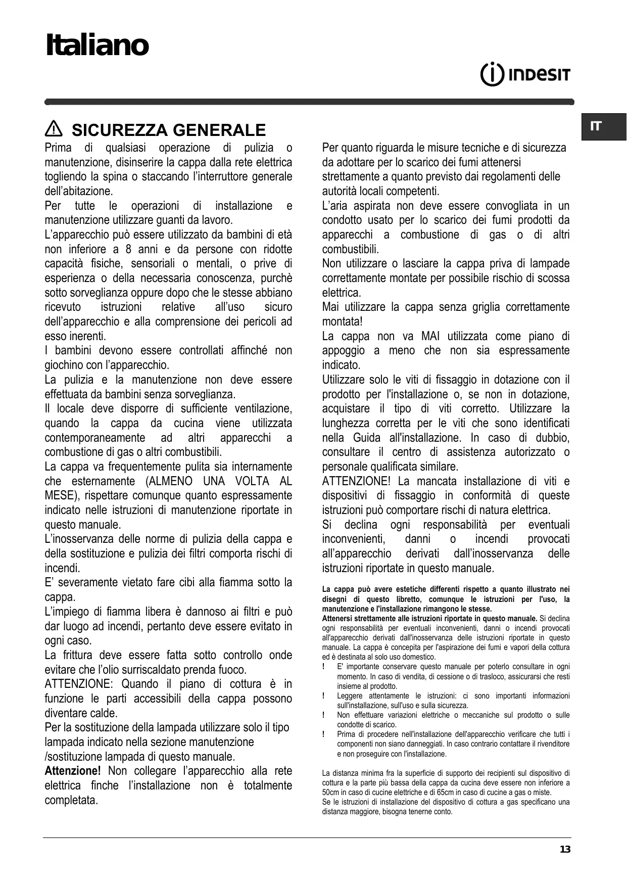 IT Per quanto riguarda le misure tecniche e di sicurezza da adottare per lo scarico dei fumi attenersi strettamente a quanto previsto dai regolamenti delle autorità locali competenti. L’aria aspirata non deve essere convogliata in un condotto usato per lo scarico dei fumi prodotti da apparecchi a combustione di gas o di altri combustibili. Non utilizzare o lasciare la cappa priva di lampade correttamente montate per possibile rischio di scossa elettrica. Mai utilizzare la cappa senza griglia correttamente montata! La cappa non va MAI utilizzata come piano di appoggio a meno che non sia espressamente indicato. Utilizzare solo le viti di fissaggio in dotazione con il prodotto per l'installazione o, se non in dotazione, acquistare il tipo di viti corretto. Utilizzare la lunghezza corretta per le viti che sono identificati nella Guida all'installazione. In caso di dubbio, consultare il centro di assistenza autorizzato o personale qualificata similare. ATTENZIONE! La mancata installazione di viti e dispositivi di fissaggio in conformità di queste istruzioni può comportare rischi di natura elettrica. Si declina ogni responsabilità per eventuali inconvenienti, danni o incendi provocati all’apparecchio derivati dall’inosservanza delle istruzioni riportate in questo manuale. La cappa può avere estetiche differenti rispetto a quanto illustrato nei disegni di questo libretto, comunque le istruzioni per l'uso, la manutenzione e l'installazione rimangono le stesse. Attenersi strettamente alle istruzioni riportate in questo manuale. Si declina ogni responsabilità per eventuali inconvenienti, danni o incendi provocati all'apparecchio derivati dall'inosservanza delle istruzioni riportate in questo manuale. La cappa è concepita per l'aspirazione dei fumi e vapori della cottura ed è destinata al solo uso domestico. ! E' importante conservare questo manuale per poterlo consultare in ogni momento. In caso di vendita, di cessione o di trasloco, assicurarsi che resti insieme al prodotto. ! Leggere attentamente le istruzioni: ci sono importanti informazioni sull'installazione, sull'uso e sulla sicurezza. ! Non effettuare variazioni elettriche o meccaniche sul prodotto o sulle condotte di scarico. ! Prima di procedere nell'installazione dell'apparecchio verificare che tutti i componenti non siano danneggiati. In caso contrario contattare il rivenditore e non proseguire con l'installazione. La distanza minima fra la superficie di supporto dei recipienti sul dispositivo di cottura e la parte più bassa della cappa da cucina deve essere non inferiore a 50cm in caso di cucine elettriche e di 65cm in caso di cucine a gas o miste. Se le istruzioni di installazione del dispositivo di cottura a gas specificano una distanza maggiore, bisogna tenerne conto.