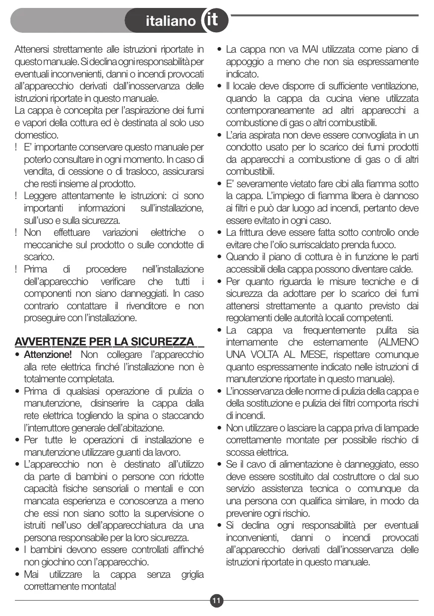 it • La cappa non va MAI utilizzata come piano di appoggio a meno che non sia espressamente indicato. • Il locale deve disporre di sufficiente ventilazione, quando la cappa da cucina viene utilizzata contemporaneamente ad altri apparecchi a combustione di gas o altri combustibili. • L’aria aspirata non deve essere convogliata in un condotto usato per lo scarico dei fumi prodotti da apparecchi a combustione di gas o di altri combustibili. • E’ severamente vietato fare cibi alla fiamma sotto la cappa. L’impiego di fiamma libera è dannoso ai filtri e può dar luogo ad incendi, pertanto deve essere evitato in ogni caso. • La frittura deve essere fatta sotto controllo onde evitare che l’olio surriscaldato prenda fuoco. • Quando il piano di cottura è in funzione le parti accessibili della cappa possono diventare calde. • Per quanto riguarda le misure tecniche e di sicurezza da adottare per lo scarico dei fumi attenersi strettamente a quanto previsto dai regolamenti delle autorità locali competenti. • La cappa va frequentemente pulita sia internamente che esternamente (ALMENO UNA VOLTA AL MESE, rispettare comunque quanto espressamente indicato nelle istruzioni di manutenzione riportate in questo manuale). • L’inosservanza delle norme di pulizia della cappa e della sostituzione e pulizia dei filtri comporta rischi di incendi. • Non utilizzare o lasciare la cappa priva di lampade correttamente montate per possibile rischio di scossa elettrica. • Se il cavo di alimentazione è danneggiato, esso deve essere sostituito dal costruttore o dal suo servizio assistenza tecnica o comunque da una persona con qualifica similare, in modo da prevenire ogni rischio. • Si declina ogni responsabilità per eventuali inconvenienti, danni o incendi provocati all’apparecchio derivati dall’inosservanza delle istruzioni riportate in questo manuale.