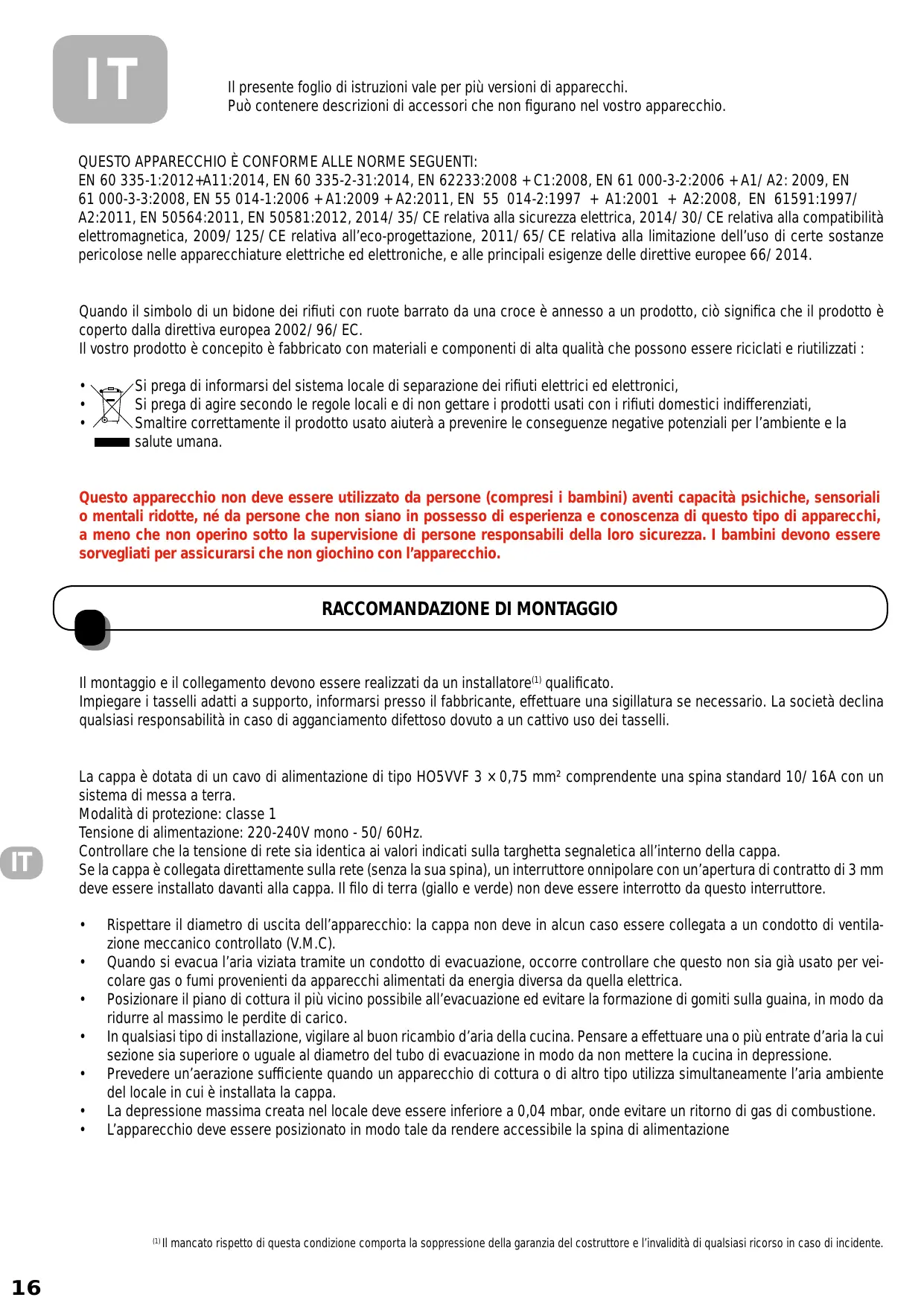 CONSEILS POUR L’ÉCONOMIE D’ÉNERGIE 1) Lorsque vous commencez à cuisiner, activez la hotte à la vitesse minimum pour contrôler l’humidité et éliminer les odeurs de cuisine. 2) N’utilisez la vitesse intensive lorsque cela est strictement nécessaire. 3) Augmentez la vitesse de la hotte seulement lorsque la quantité de vapeur le requiert. 4) Veillez à ce que le ou les filtres de la hotte soient toujours propres, afin d’optimiser l’efficacité anti -graisse et anti-odeurs. Norme di riferimento: Normative references: Normes de référence : EN/IEC 61591 EN/IEC 61591 EN 50564