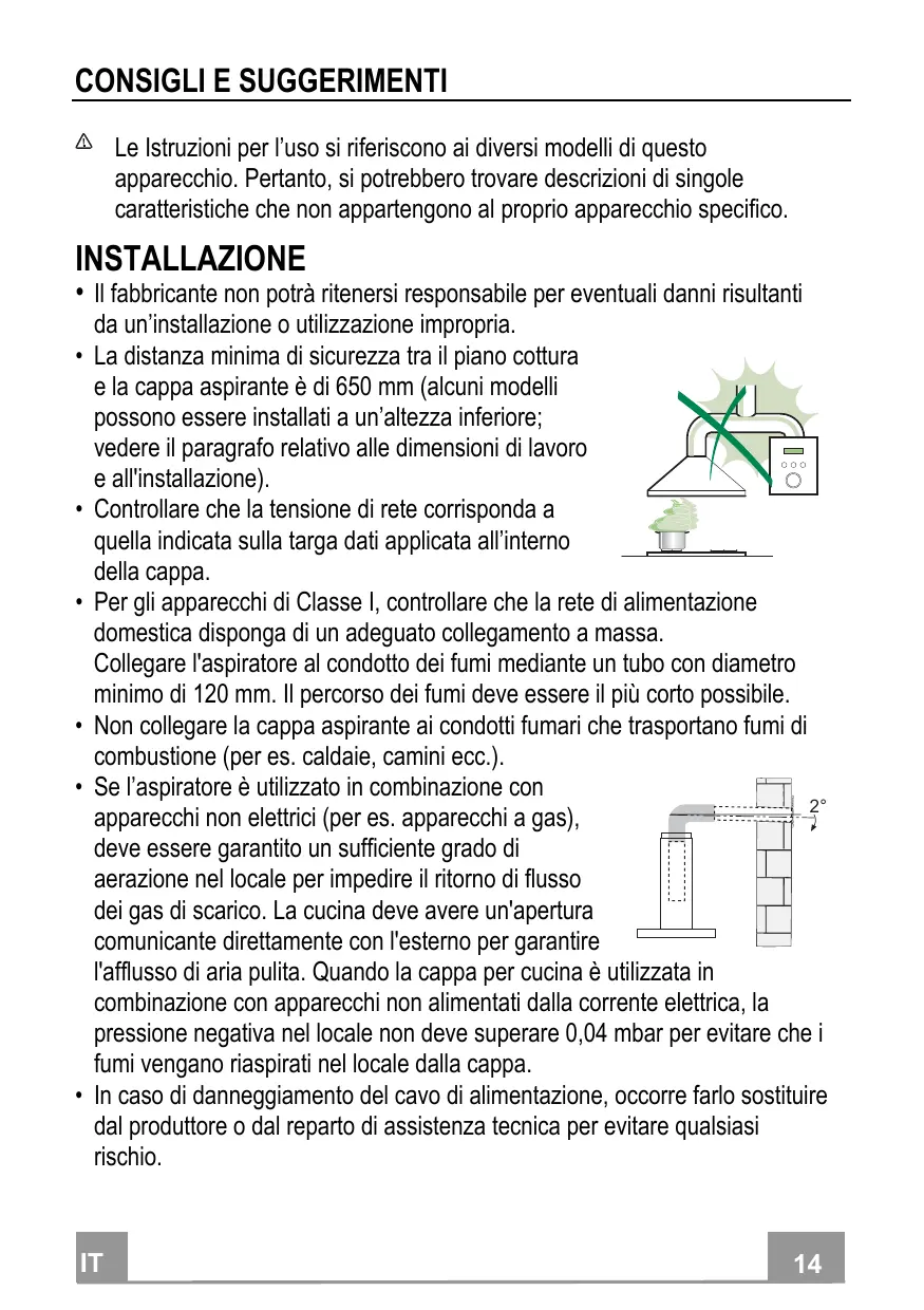 da un’installazione o utilizzazione impropria. La distanza minima di sicurezza tra il piano cottura e la cappa aspirante è di 650 mm (alcuni modelli possono essere installati a un’altezza inferiore; vedere il paragrafo relativo alle dimensioni di lavoro e all'installazione). Controllare che la tensione di rete corrisponda a quella indicata sulla targa dati applicata all’interno della cappa. Per gli apparecchi di Classe I, controllare che la rete di alimentazione domestica disponga di un adeguato collegamento a massa. Collegare l'aspiratore al condotto dei fumi mediante un tubo con diametro minimo di 120 mm. Il percorso dei fumi deve essere il più corto possibile. Non collegare la cappa aspirante ai condotti fumari che trasportano fumi di combustione (per es. caldaie, camini ecc.). Se l’aspiratore è utilizzato in combinazione con apparecchi non elettrici (per es. apparecchi a gas), deve essere garantito un sufficiente grado di aerazione nel locale per impedire il ritorno di flusso dei gas di scarico. La cucina deve avere un'apertura comunicante direttamente con l'esterno per garantire l'afflusso di aria pulita. Quando la cappa per cucina è utilizzata in combinazione con apparecchi non alimentati dalla corrente elettrica, la pressione negativa nel locale non deve superare 0,04 mbar per evitare che i fumi vengano riaspirati nel locale dalla cappa. In caso di danneggiamento del cavo di alimentazione, occorre farlo sostituire dal produttore o dal reparto di assistenza tecnica per evitare qualsiasi rischio.