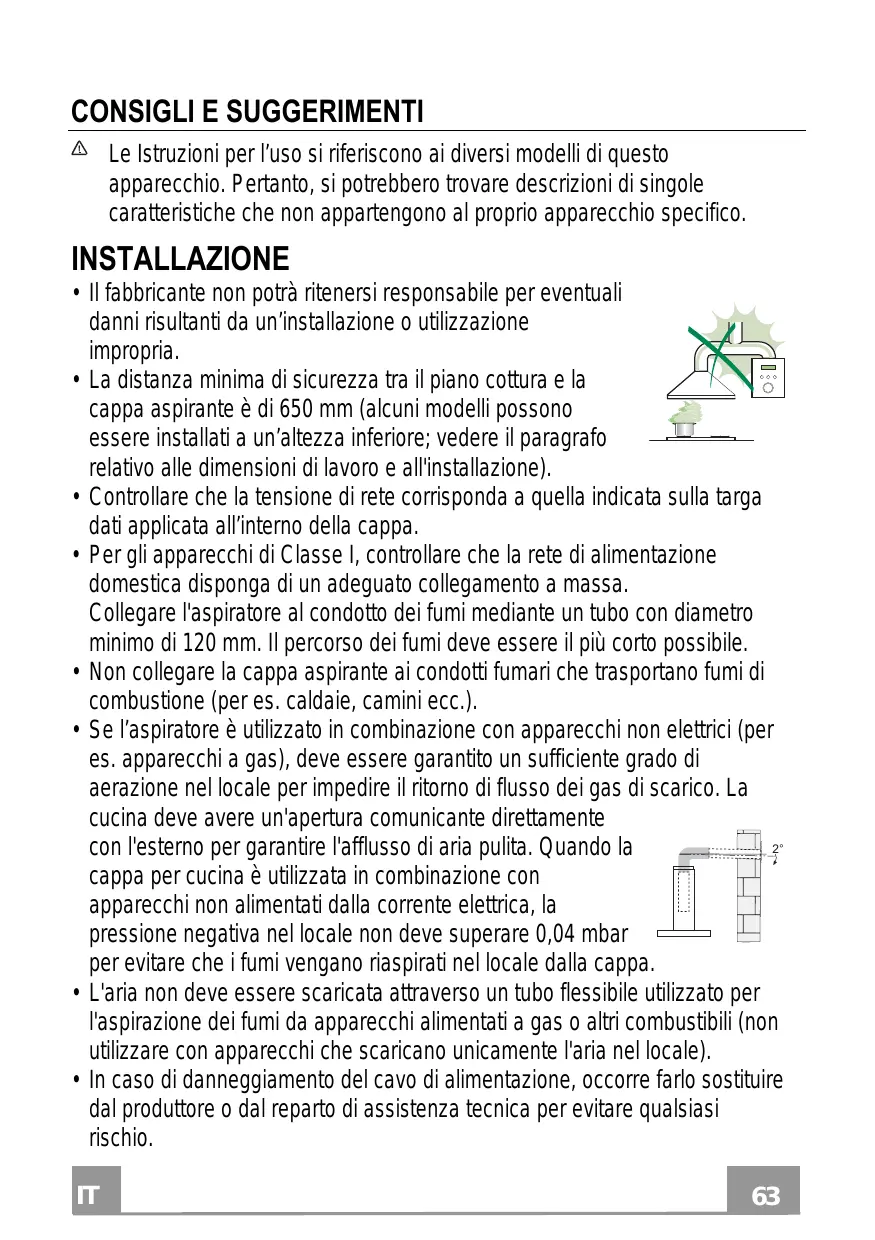 - Non collegare la cappa aspirante ai condotti fumari che trasportano fumi di combustione (per es. caldaie, camini ecc.).