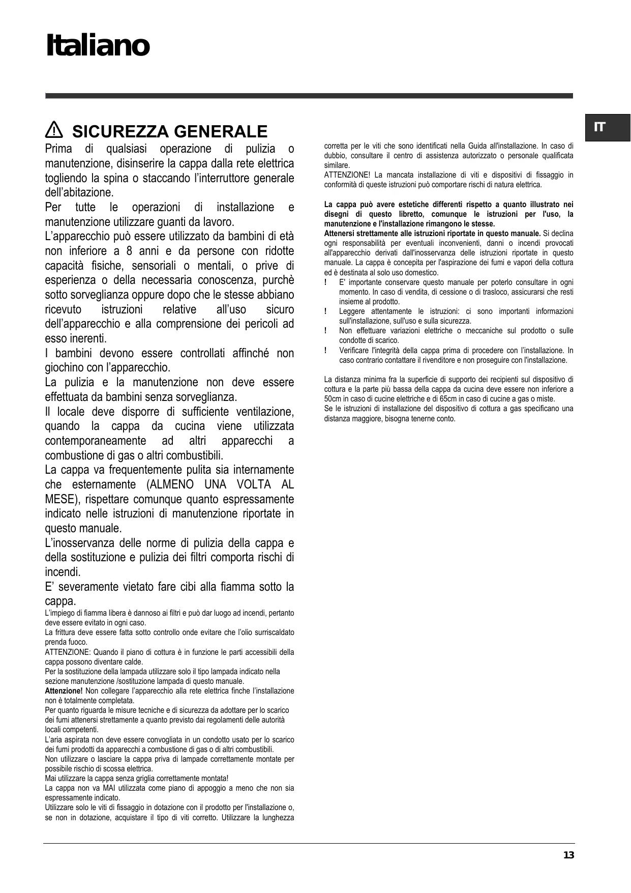 À SICUREZZA GENERALE Prima di dqualsiasi operazione di pulizia o manutenzione, disinserire la cappa dalla rete elettrica togliendo la spina o staccando l'interruttore generale dell'abitazione.