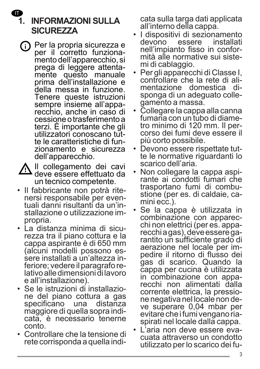 1. SICHERHEITSINFORMA TIONEN Lesen Sie bitte für Ihre eigene Sicherheit und die korrekte Funktion des Geräts diese Betriebsanleitung sorgfältig durch, bevor Sie es installieren und in Betrieb nehmen. Bewahren Sie die Betriebsanleitung stets zusammen mit dem Gerät auf, auch falls Sie dieses verkaufen oder Dritten überlassen. Es ist wichtig, dass die Benutzer mit allen Funktionsund Sicherheitsmerkmalen des Gerätes vertraut sind. Die Kabel müssen von kompetentem Fachpersonal angeschlossen werden. • En aucun cas le fabricant ne peut être tenu pour responsable de dommages éventuellement dus à une installation ou à une utilisation impropre. • La distance de sécurité minimum entre la table de cuisson et la hotte aspirante est de 650 mm (certains modèles peuvent être installés à une hauteur inférieure ; voir le paragraphe concernant les dimensions de travail et l’installation). • Si les instructions d’installation de la table de cuisson à gaz spécifient une distance supérieure à celle indiquée ci-