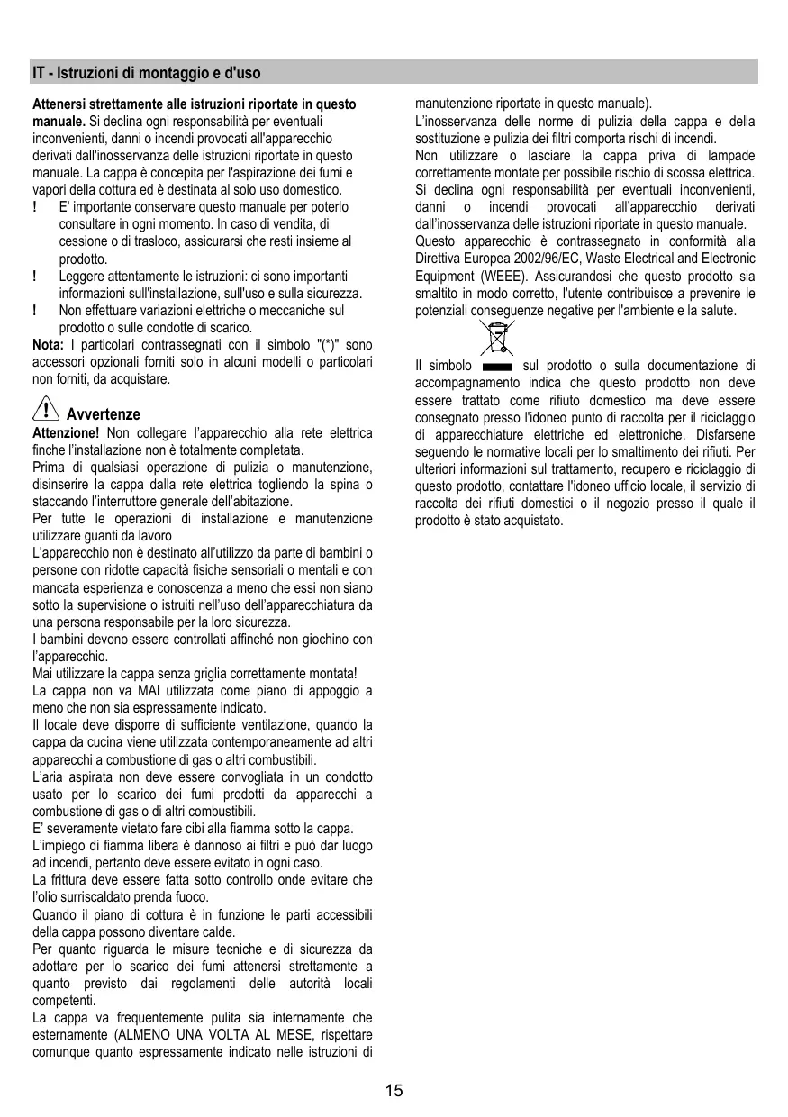 Инструкции по монтажу и эксплуатации Інструкція з монтажу і експлуатації Paigaldus- ja kasutusjuhend montavimo ir naudojimosi instrukcija ierīkošanas un izmantošanas instrukcija Uputstva za montažu i upotrebu Navodila za montažo in uporabo Uputstva za montažu i za uporabu Montaj ve kullanım talimatları ﻋﻤﺎلﻃ ﺮق اﻟﺘﺮآﻴ ﺐ واﻻﺳ ﺖ IT - Istruzioni di montaggio e d'uso manutenzione riportate in questo manuale). L’inosservanza delle norme di pulizia della cappa e della sostituzione e pulizia dei filtri comporta rischi di incendi. Non utilizzare o lasciare la cappa priva di lampade correttamente montate per possibile rischio di scossa elettrica. Si declina ogni responsabilità per eventuali inconvenienti, danni o incendi provocati all’apparecchio derivati dall’inosservanza delle istruzioni riportate in questo manuale. Questo apparecchio è contrassegnato in conformità alla Direttiva Europea 2002/96/EC, Waste Electrical and Electronic Equipment (WEEE). Assicurandosi che questo prodotto sia smaltito in modo corretto, l'utente contribuisce a prevenire le potenziali conseguenze negative per l'ambiente e la salute. Attenersi strettamente alle istruzioni riportate in questo manuale. Si declina ogni responsabilità per eventuali inconvenienti, danni o incendi provocati all'apparecchio derivati dall'inosservanza delle istruzioni riportate in questo manuale. La cappa è concepita per l'aspirazione dei fumi e vapori della cottura ed è destinata al solo uso domestico. E' importante conservare questo manuale per poterlo consultare in ogni momento. In caso di vendita, di cessione o di trasloco, assicurarsi che resti insieme al prodotto. Leggere attentamente le istruzioni: ci sono importanti informazioni sull'installazione, sull'uso e sulla sicurezza. Non effettuare variazioni elettriche o meccaniche sul prodotto o sulle condotte di scarico. Nota: I particolari contrassegnati con il simbolo "(*)" sono accessori opzionali forniti solo in alcuni modelli o particolari non forniti, da acquistare. Il simbolo sul prodotto o sulla documentazione di accompagnamento indica che questo prodotto non deve essere trattato come rifiuto domestico ma deve essere consegnato presso l'idoneo punto di raccolta per il riciclaggio di apparecchiature elettriche ed elettroniche. Disfarsene seguendo le normative locali per lo smaltimento dei rifiuti. Per ulteriori informazioni sul trattamento, recupero e riciclaggio di questo prodotto, contattare l'idoneo ufficio locale, il servizio di raccolta dei rifiuti domestici o il negozio presso il quale il prodotto è stato acquistato. Avvertenze Attenzione! Non collegare l’apparecchio alla rete elettrica finche l’installazione non è totalmente completata. Prima di qualsiasi operazione di pulizia o manutenzione, disinserire la cappa dalla rete elettrica togliendo la spina o staccando l’interruttore generale dell’abitazione. Per tutte le operazioni di installazione e manutenzione utilizzare guanti da lavoro L’apparecchio non è destinato all’utilizzo da parte di bambini o persone con ridotte capacità fisiche sensoriali o mentali e con mancata esperienza e conoscenza a meno che essi non siano sotto la supervisione o istruiti nell’uso dell’apparecchiatura da una persona responsabile per la loro sicurezza. I bambini devono essere controllati affinché non giochino con l’apparecchio. Mai utilizzare la cappa senza griglia correttamente montata! La cappa non va MAI utilizzata come piano di appoggio a meno che non sia espressamente indicato. Il locale deve disporre di sufficiente ventilazione, quando la cappa da cucina viene utilizzata contemporaneamente ad altri apparecchi a combustione di gas o altri combustibili. L’aria aspirata non deve essere convogliata in un condotto usato per lo scarico dei fumi prodotti da apparecchi a combustione di gas o di altri combustibili. E’ severamente vietato fare cibi alla fiamma sotto la cappa. L’impiego di fiamma libera è dannoso ai filtri e può dar luogo ad incendi, pertanto deve essere evitato in ogni caso. La frittura deve essere fatta sotto controllo onde evitare che l’olio surriscaldato prenda fuoco. Quando il piano di cottura è in funzione le parti accessibili della cappa possono diventare calde. Per quanto riguarda le misure tecniche e di sicurezza da adottare per lo scarico dei fumi attenersi strettamente a quanto previsto dai regolamenti delle autorità locali competenti. La cappa va frequentemente pulita sia internamente che esternamente (ALMENO UNA VOLTA AL MESE, rispettare comunque quanto espressamente indicato nelle istruzioni di