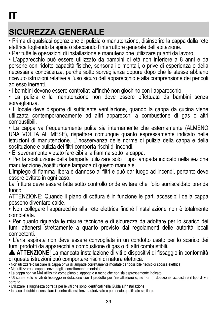 • Prima di qualsiasi operazione di pulizia o manutenzione, disinserire la cappa dalla rete elettrica togliendo la spina o staccando l’interruttore generale dell’abitazione. • Per tutte le operazioni di installazione e manutenzione utilizzare guanti da lavoro. • L’apparecchio può essere utilizzato da bambini di età non inferiore a 8 anni e da persone con ridotte capacità fisiche, sensoriali o mentali, o prive di esperienza o della necessaria conoscenza, purché sotto sorveglianza oppure dopo che le stesse abbiano ricevuto istruzioni relative all’uso sicuro dell’apparecchio e alla comprensione dei pericoli ad esso inerenti. • I bambini devono essere controllati affinché non giochino con l’apparecchio. • La pulizia e la manutenzione non deve essere effettuata da bambini senza sorveglianza. • Il locale deve disporre di sufficiente ventilazione, quando la cappa da cucina viene utilizzata contemporaneamente ad altri apparecchi a combustione di gas o altri combustibili. • La cappa va frequentemente pulita sia internamente che esternamente (ALMENO UNA VOLTA AL MESE), rispettare comunque quanto espressamente indicato nelle istruzioni di manutenzione. L’inosservanza delle norme di pulizia della cappa e della sostituzione e pulizia dei filtri comporta rischi di incendi. • E’ severamente vietato fare cibi alla fiamma sotto la cappa. • Per la sostituzione della lampada utilizzare solo il tipo lampada indicato nella sezione manutenzione /sostituzione lampada di questo manuale. L’impiego di fiamma libera è dannoso ai filtri e può dar luogo ad incendi, pertanto deve essere evitato in ogni caso. La frittura deve essere fatta sotto controllo onde evitare che l’olio surriscaldato prenda fuoco. ATTENZIONE: Quando il piano di cottura è in funzione le parti accessibili della cappa possono diventare calde. • Non collegare l’apparecchio alla rete elettrica finché l’installazione non è totalmente completata. • Per quanto riguarda le misure tecniche e di sicurezza da adottare per lo scarico dei fumi attenersi strettamente a quanto previsto dai regolamenti delle autorità locali competenti. • L’aria aspirata non deve essere convogliata in un condotto usato per lo scarico dei fumi prodotti da apparecchi a combustione di gas o di altri combustibili. ATTENZIONE! La mancata installazione di viti e dispositivi di fissaggio in conformità di queste istruzioni può comportare rischi di natura elettrica.