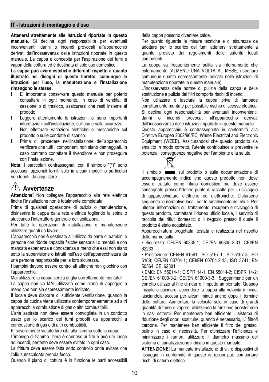 - EMC: EN 55014-1; CISPR 14-1; EN 55014-2; CISPR 14-2; CEI/EN 61000-3-2; CEI/EN 61000-3-3. Suggestimento per un corretto utilizzato al fine di ridurre l'impatto ambientale: quando iniziata a cucinare, accendere la cappa alla velocità minima, lasciandola accesa per alcuni minuti anche dello termine della cottura. Aumentare la velocità solo in caso di grande quantità di fumo e vapore, utilizzando la funzione booster solo in casi estremi. Per mantenere ben efficiente il systemadi riduzione degli odori, sostituire, quando è necessario, il/filteri/ carbone. Per mantenere ben efficiente il filtrlo del grasso, pulirlo in caso di necessità. Per ottimizzare l'efficienza e minimizzazione i rumori, utilizzare il diametro massimo delsystema di canalizzazione individato in questo manuale.