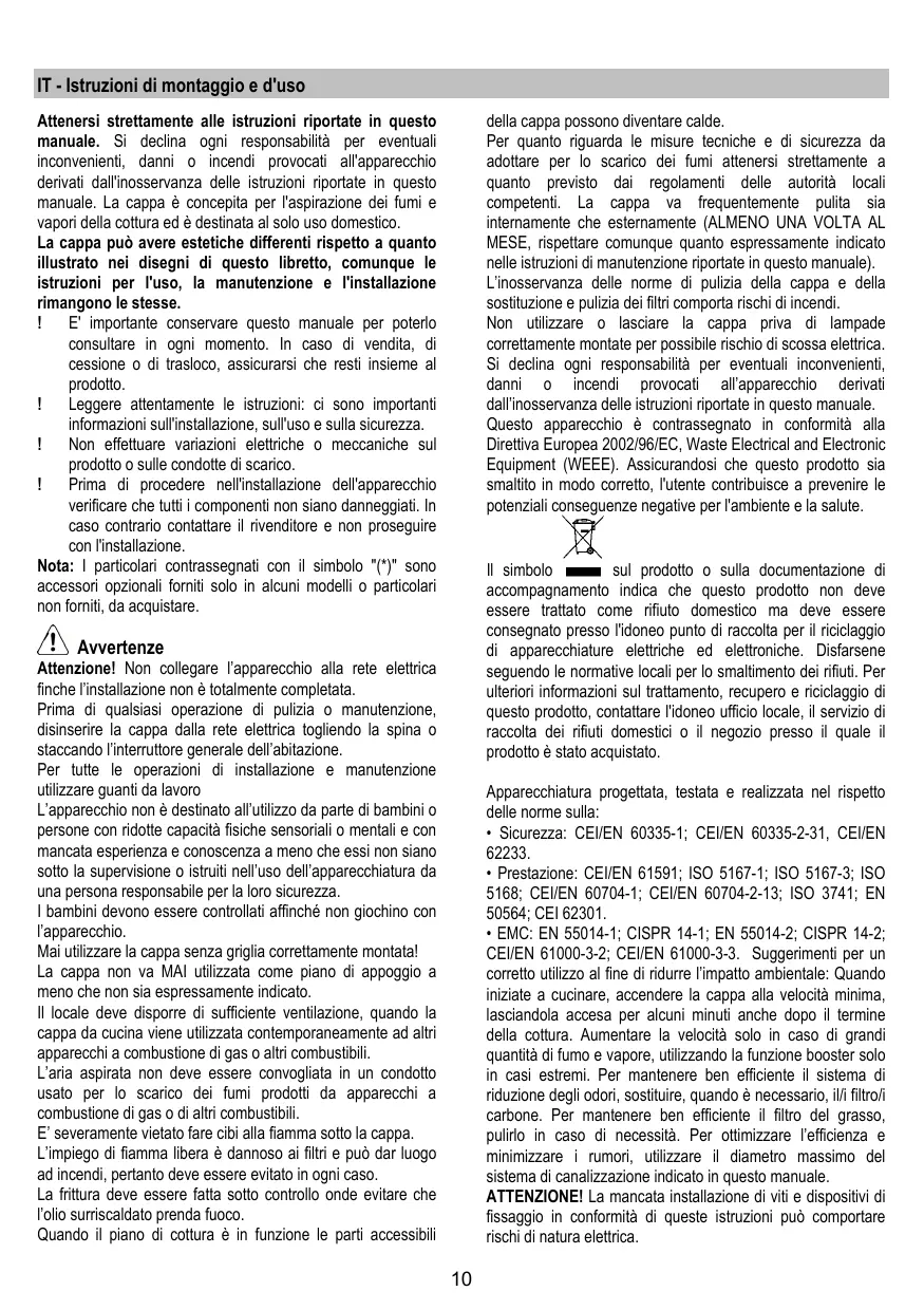 Non utilizzato o lasciare la cappa priva di lampade correttamente montate per possibile rischio di scossa elettrica. Si declina ongi responsabilità per eventuali inconvenienti, danni o incendi provocati all'apprecchio derivati dall'inosservanza delle struzioni riportate in questo manuale. Questo apprecchio è contrassegnato in conformità alla Direttiva Europea 2002/96/EC, Waste Electrical and Electronic Equipment (WEEE). Assicurandosi che sono prodotto sua smalito in modo correto, l'utente contribuisce a prevenir le potenziali consequences negative per l'ambiente e la salute.