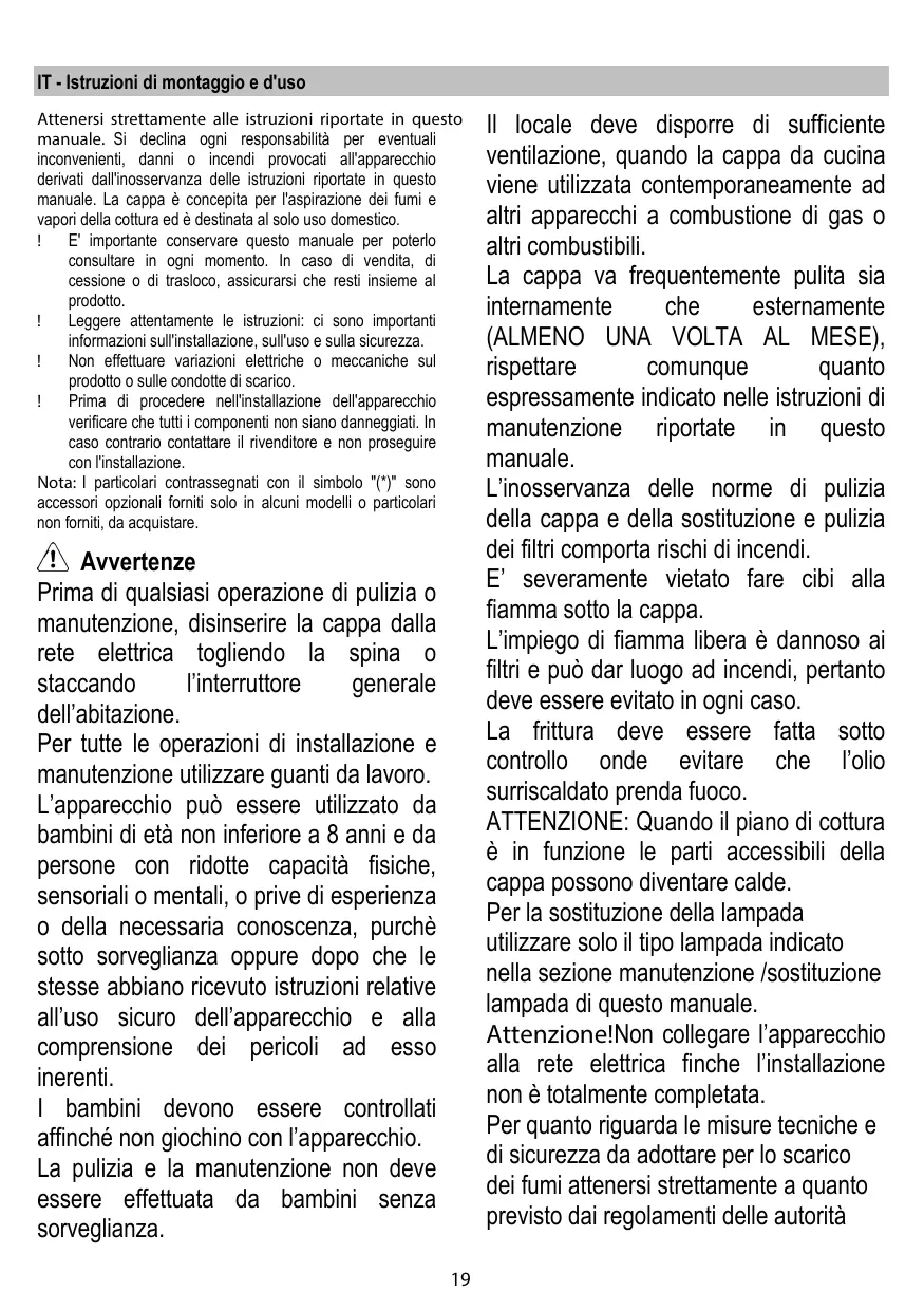 IT - Istruzioni di montaggio e d'uso Attenersi strettamente alle istruzioni riportate in questo manuale. Si declina ogni responsabilità per eventuali inconvenienti, danni o incendi provocati all'apparecchio derivati dall'inosservanza delle istruzioni riportate in questo manuale. La cappa è concepita per l'aspirazione dei fumi e vapori della cottura ed è destinata al solo uso domestico. ! E' importante conservare questo manuale per poterlo consultare in ogni momento. In caso di vendita, di cessione o di trasloco, assicurarsi che resti insieme al prodotto. ! Leggere attentamente le istruzioni: ci sono importanti informazioni sull'installazione, sull'uso e sulla sicurezza. ! Non effettuare variazioni elettriche o meccaniche sul prodotto o sulle condotte di scarico. ! Prima di procedere nell'installazione dell'apparecchio verificare che tutti i componenti non siano danneggiati. In caso contrario contattare il rivenditore e non proseguire con l'installazione. Nota: I particolari contrassegnati con il simbolo "(*)" sono accessori opzionali forniti solo in alcuni modelli o particolari non forniti, da acquistare.