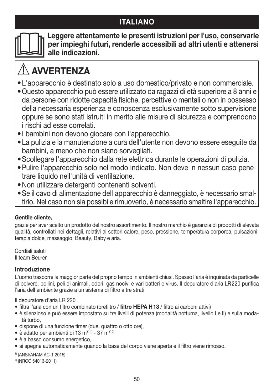 - Se il cavo di alimentazione dell'apparecchio è danneggiato, è necessario smaltirlo. Nel caso non sia possibile rimuoverlo, è necessario smaltire l'apparecchio. Gentile cliente, grazie per aver scelto un prodotto del nostro assortimento. Il nostro marchio è garanzia di prodotti di elevata qualità, controllati nei dettagli, relativi ai settori calore, peso, pressione, temperatura corporea, pulsazioni, terapia dolce, massaggio, Beauty, Baby e aria. Cordiali saluti Il team Beurer Introduzione L'uomo trascorre la maggior parte del proprio tempo in ambienti chiusi. Spesso l'aria è inquinata da particelle di polvere, pollini, peli di animali, odori, gas nocivi e vari batteri e virus. Il depuratore d'aria LR 220 purifica l'aria dell'ambiente grazie a un sistema di filtro a tre strati. Il depuratore d'aria LR 220