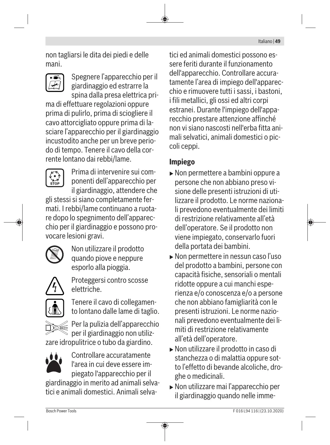 priée de l’outil de jardin. Conserver les instructions d’utilisation à un endroit sûr pour pouvoir les consulter ultérieurement. Explication des symboles se trouvant sur l’outil de jardin Indications générales sur d’éventuels dangers. Lire soigneusement ces instructions d’utilisation. Prendre les précautions nécessaires pour que les personnes se trouvant à proximité ne risquent pas d’être blessées par des projections provenant de l’outil. Avertissement : Maintenir une distance de sécurité quand l’outil de jardin est en marche. Attention : ne touchez pas les lames en rotation. Les lames sont coupantes. Attention à ne pas se faire couper les orteils ou les doigts. Arrêter l’outil de jardin et retirer la fiche de la prise de courant avant d’effectuer des réglages sur l’appareil ou de le nettoyer, lorsque le câble se trouve coincé ou que l’appareil soit laissé sans surveillance même pour une courte durée. Maintenir le câble éloigné des griffes/ lames. Attendre l’arrêt total de tous les éléments de l’outil de jardin avant de les toucher. Bosch Power Tools