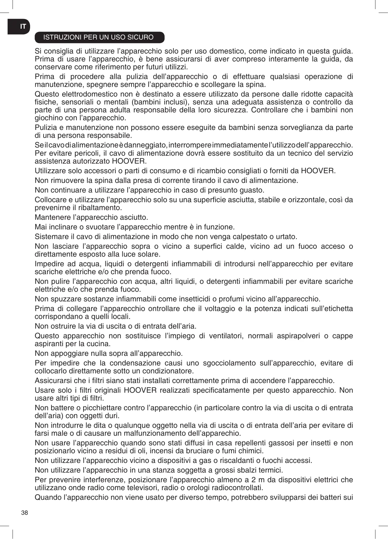 Le nettoyage et l’entretien ne devraient pas être effectués par des enfants sans supervision. Si le cordon d’alimentation est endommagé, arrêtez immédiatement d’utiliser l’appareil. Pour éviter les risques d’accident, un réparateur HOOVER agréé doit remplacer le cordon d’alimentation. N’utilisez que les accessoires, consommables ou pièces détachées recommandés ou fournis par HOOVER. Ne débranchez pas l’appareil en tirant le cordon d’alimentation. Ne continuez pas à utiliser votre appareil s’il semble défectueux. Placez et utilisez l’appareil uniquement sur une surface sèche, stable et à l’horizontale afin d’éviter le basculement. Gardez l’appareil sec. N’inclinez ou ne videz jamais l’appareil pendant le fonctionnement. Posez le cordon d’alimentation de façon à ce que personne ne le piétine ou n’y trébuche. Ne placez pas l’appareil sur des surfaces chaudes, près de surfaces chaudes, près de feux ouverts ou directement exposé aux rayons du soleil. Ne laissez pas que de l’eau ou tout autre liquide ou détergent inflammable pénètre dans l’appareil pour éviter tout risque d’électrocution et/ou d’incendie. Ne nettoyez pas l’appareil avec de l’eau, tout autre liquide ou un détergent (inflammable) pour éviter tout risque d’électrocution et/ou d’incendie. Ne vaporisez pas de produits inflammables comme des insecticides ou des parfumeurs autour de l’appareil. Vérifiez si la tension et les puissances indiquées sur l’étiquette de l’appareil correspondent à la tension d’alimentation locale avant de brancher l’appareil. Ne bloquez pas l’entrée ou la sortie de l’air. Cet appareil ne remplace pas une ventilation correcte, un nettoyage régulier avec l’aspirateur ou l’utilisation d’une hotte aspirante ou d’un ventilateur pendant que vous cuisinez. Ne placez rien sur l’appareil. Ne placez pas l’appareil directement en dessous d’un climatiseur pour éviter que le condensat dégouline dans l’appareil. Assurez-vous que les filtres soient convenablement montés avant d’allumer l’appareil. Utilisez uniquement les filtres originaux HOOVER spécifiques pour cet appareil. N’utilisez pas d’autres filtres. Évitez de frapper contre l’appareil (l’entrée et la sortie de l’air en particulier) avec des objets durs. N’enfilez pas vos doigts ou des objets dans la sortie de l’air ou dans l’entrée de l’air pour éviter des blessures ou un dysfonctionnement de l’appareil. N’utilisez pas cet appareil quand vous avez utilisez des répulsifs pour insectes à fumée intérieure ou dans des endroits avec des résidus d’huile, de l’encens brûlant ou des fumées chimiques. N’utilisez pas cet appareil près d’appareils à gaz, de dispositifs chauffants ou des cheminées. N’utilisez pas l’appareil dans une chambre avec des changements de températures importants. Pour éviter les interférences, placez l’appareil au moins à 2 m de tout appareil électrique qui utilise les ondes radio aériennes comme les TV, les radios et les horloges radio-pilotées. Quand l’appareil n’est pas utilisé pendant longtemps, des bactéries peuvent proliférer sur les 14