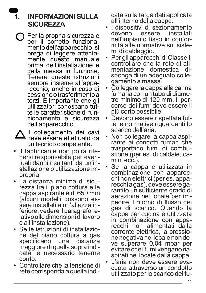 Pour les appareils de Classe I, s’assurer que l’installation électrique de votre intérieur dispose d’une mise à la terre adéquate Relier la hotte au conduit de cheminée avec un tube ayant un diamètre minimum de 120 mm. Le parcours des fumées doit être le plus court possible. Respecter toutes les normes concernant l’évacuation de l’air. Ne pas relier la hotte aspirante aux conduits de cheminée qui acheminent les fumées de combustion (par ex. de chaudières, de cheminées, etc.). Si vous utilisez l’aspirateur en même temps que des appareils non électriques (par ex. appareils à gaz), veillez à ce que la pièce soit adéquatement ventilée, afin d’empêcher le retour du flux des gaz d’évacuation. Si vous utilisez la hotte de cuisine en même temps que des appareils non alimentés à l’électricité, la pression négative dans la pièce ne doit pas dépasser 7
