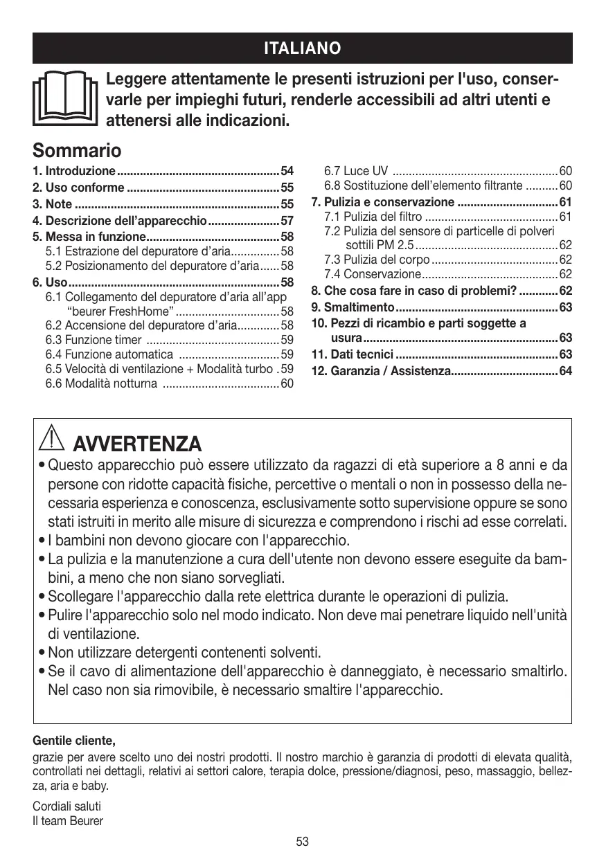- Se il cavo di alimentazione dell'apparecchio è danneggiato, è necessario smaltirlo. Nel caso non sia rimovibile, è necessario smaltire l'apparecchio. Gentile cliente, grazie per avere scelto uno dei nostri prodotti. Il nostro marchio è garanzia di prodotti di elevata qualità, controllati nei dettagli, relativi ai settori calore, terapia dolce, pressione/diagnosi, peso, massaggio, bellezza, aria e baby. Cordiali saluti Il team Beurer