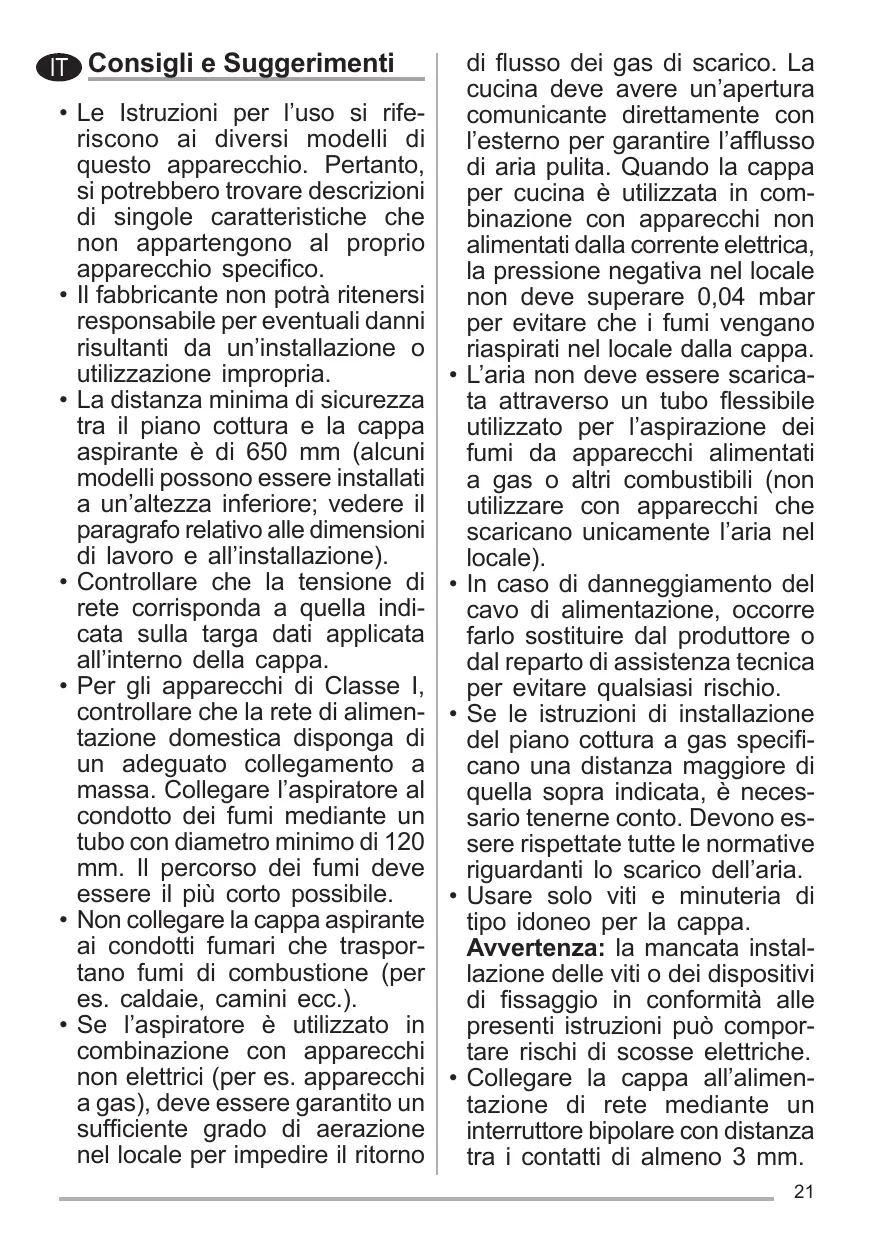 • La distance de sécurité minimum entre le plan de cuisson et la hotte aspirante est de 650 mm (certains modèles peuvent être installés à une hauteur inférieure; voir le paragraphe concernant les dimensions de travail et l’installation). • Assurez-vous que la tension de votre secteur correspond à celle indiquée sur la plaque des données appliquée à l’intérieur de la hotte. • Pour les appareils de Classe I, s’assurer que l’installation électrique de votre intérieur dispose d’une mise à la terre adéquate. Relier l’aspirateur au conduit de cheminée avec un tube d’un diamètre minimum de 120 mm. Le parcours des fumées doit être le plus court possible. • Ne pas relier la hotte aspirante aux conduits de cheminée qui acheminent les fumées de combustion (par exemple de chaudières, de cheminées, etc.).