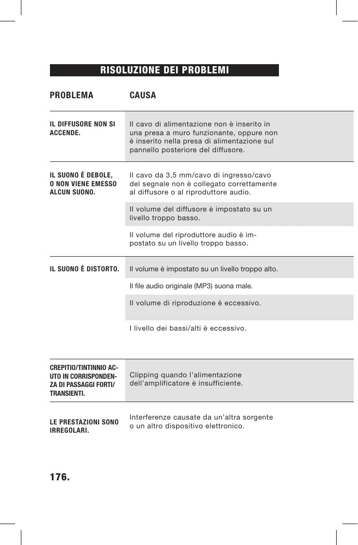 ALCUN SUONO. Il cavo da 3,5 mm/cavo di ingresso/cavo del segnale non è collegato correttamente al diffusore o al riproduttore audio. Il volume del diffusore è impostato su un livello troppo basso. Il volume del riproduttore audio è impostato su un livello troppo basso. IL SUONO È DISTORTO. Il volume è impostato su un livello troppo alto. Il file audio originale (MP3) suona male. Il volume di riproduzione è eccessivo. I livello dei bassi/alti è eccessivo. CREPITIO/TINTINNIO ACUTO IN CORRISPONDENZA DI PASSAGGI FORTI/ TRANSIENTI.