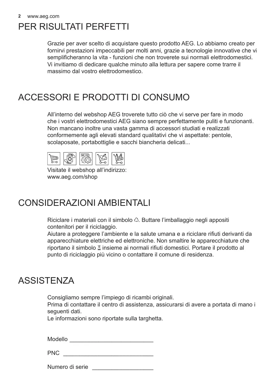 Grazie per aver scelto di-acquistare quello prodotto AEG. Lo abbiamo creato per fornirvi prestazioni impeccabili per molti anni, grazie a technologie innovative che vi amplificHERanno la vita - funzioni che non troverete sui normali elettrodomestici. Vi invitiamo di dedicare quale minuto allagettura per sapere come trattre il massimo dal vostro elettrodomestico.