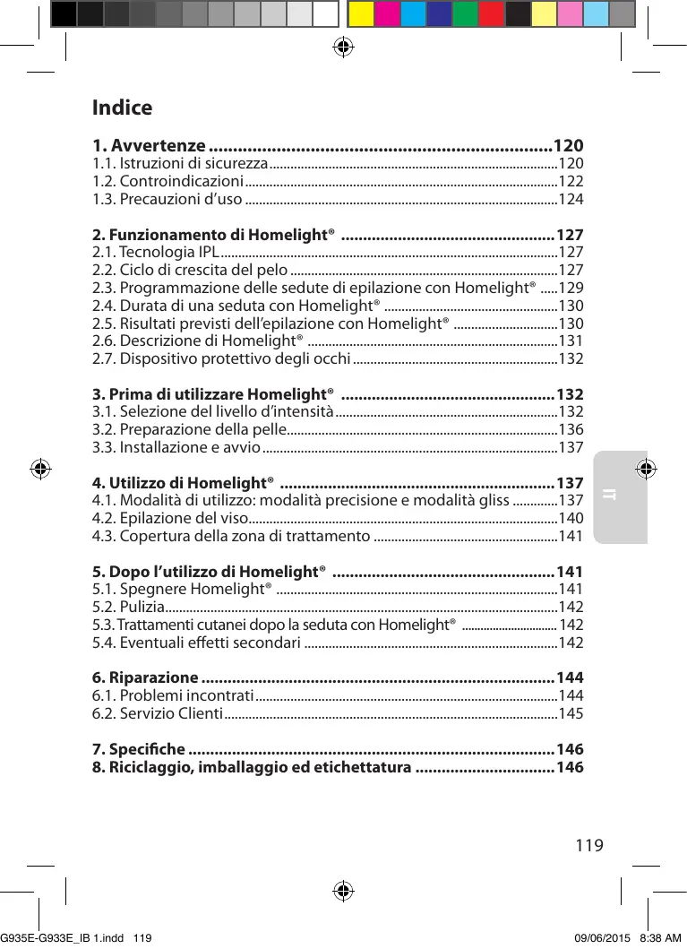 Pour les personnes avec un phototype IV ou V: • Première séance: - réglez Homelight® sur le niveau 1 d’intensité au maximum. • Deuxième séance: - si vous n’avez ressenti aucun inconfort ou désagrément particulier lors de la séance précédente, vous pouvez régler le niveau d’intensité sur 2. • Séances suivantes : - uniquement en l’absence totale d’effets secondaires à l’issue de la séance précédente, vous pouvez régler le niveau d’intensité sur MAXIMUM 3. Pour les personnes avec un phototype VI : L’utilisation de Homelight® n’est pas autorisée.