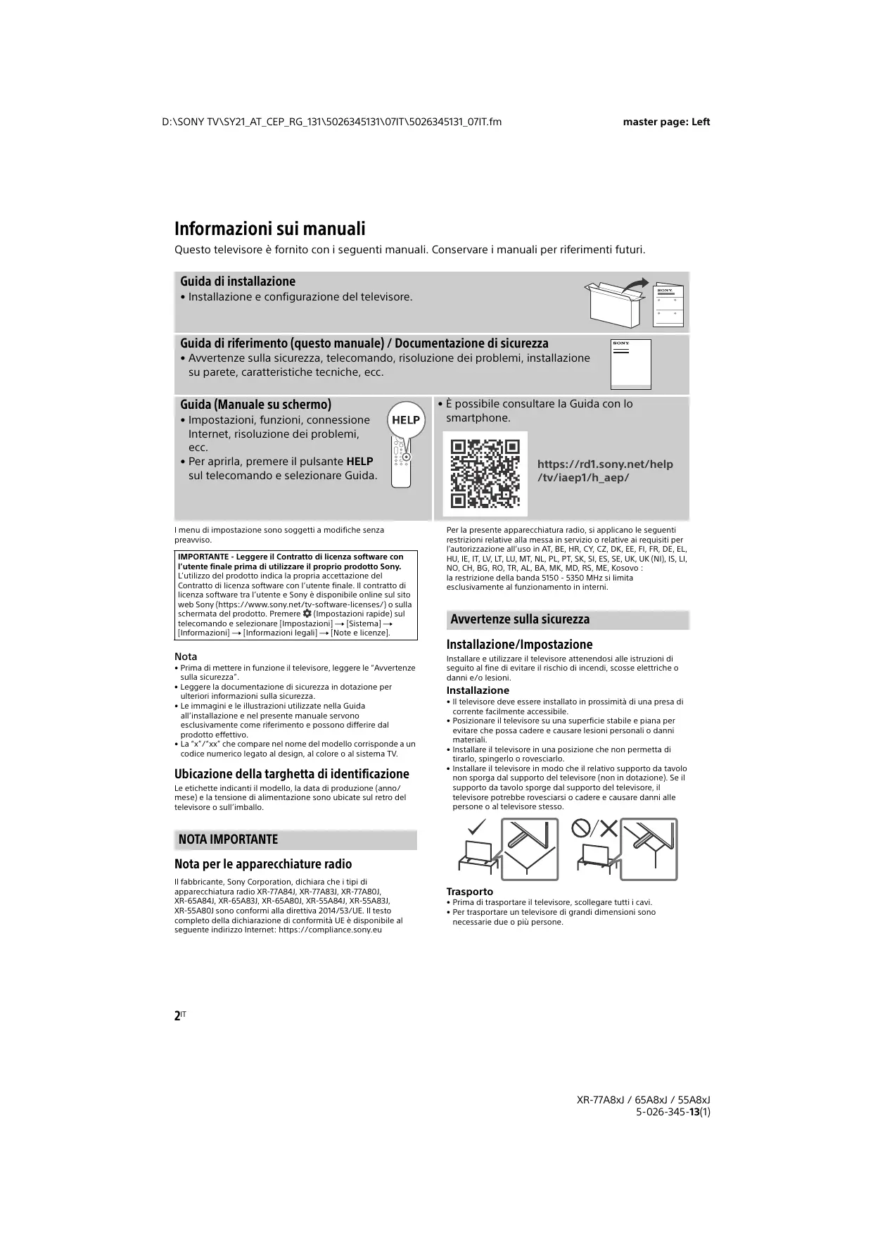 Scarica le istruzioni per il tuo Televisore in formato PDF gratuitamente! Trova il tuo manuale BRAVIA XR-55A80J - BRAVIA XR-65A80J - XR-77A80J - SONY e riprendi in mano il tuo dispositivo elettronico. In questa pagina sono pubblicati tutti i documenti necessari per l'utilizzo del tuo dispositivo. BRAVIA XR-55A80J - BRAVIA XR-65A80J - XR-77A80J del marchio SONY.