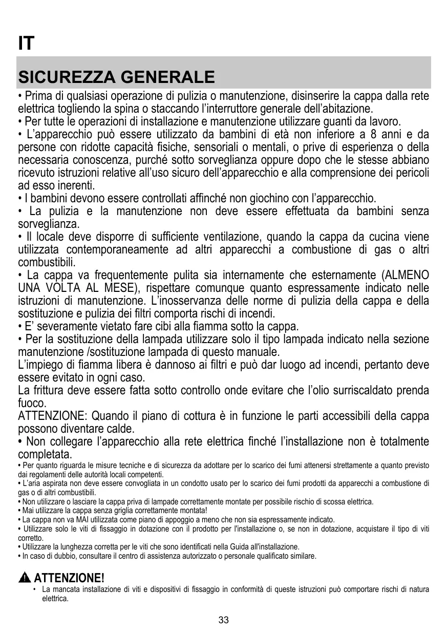 - Prima di qualsiasi operazione di pulizia o manutenzione, disinserire la cappa dalla rete elettrica togliendo la spina o staccando l’interruttore generale dell’abitazione.