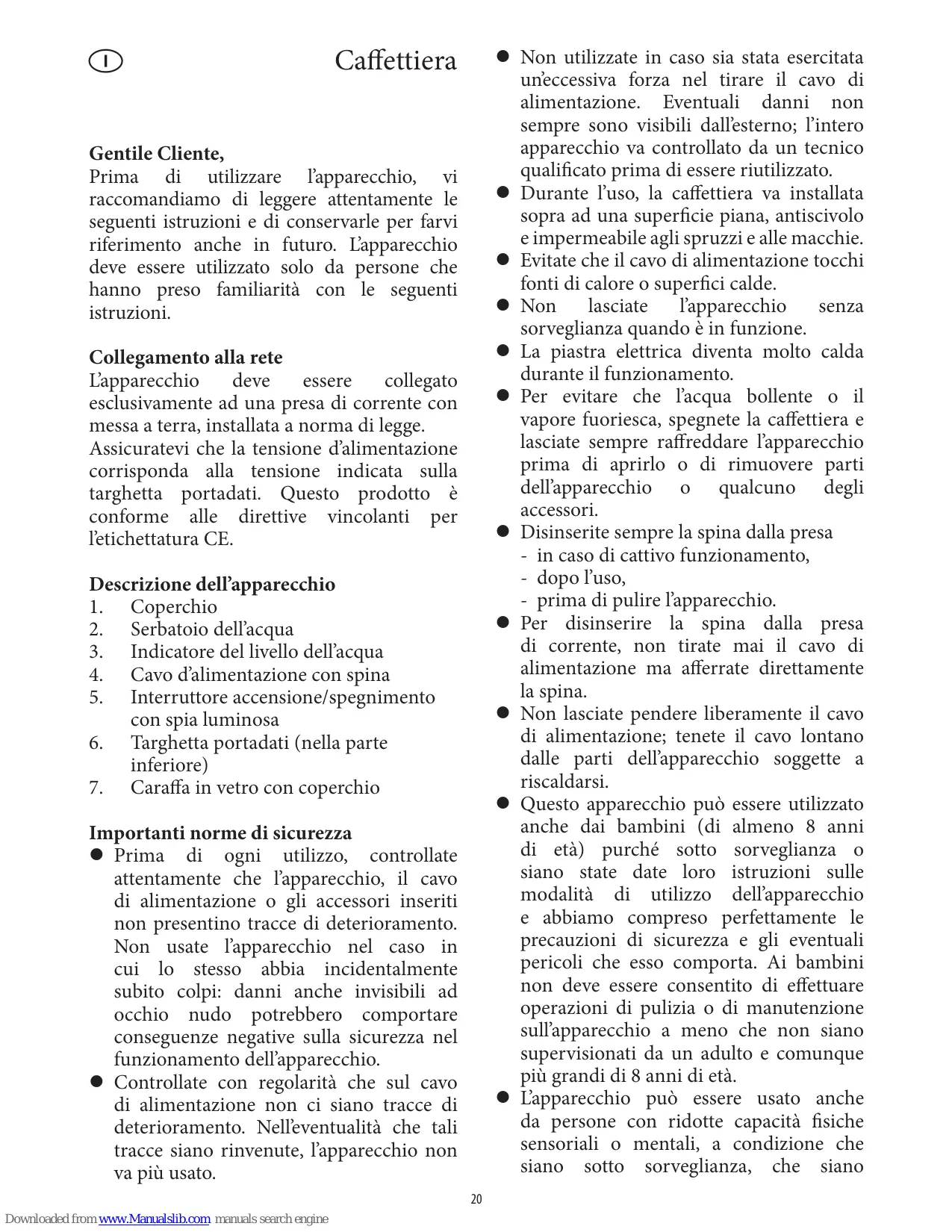state date loro istruzioni sull’uso dell’apparecchio e che comprendano pienamente i rischi e le precauzioni di sicurezza che l’apparecchio comporta. Ai bambini non deve essere consentito di giocare con l’apparecchio. Avvertenza: Tutto il materiale di imballaggio deve essere tenuto fuori della portata dei bambini a causa del rischio potenziale esistente, per esempio di soffocamento. Questo apparecchio è studiato per il solo uso domestico o per impieghi simili, come per esempio - uffici e altri ambienti commerciali, - zone agricole, - clienti di alberghi, motel e stabilimenti simili, - clienti di pensioni "bed-and-breakfast" (letto & colazione). Nessuna responsabilità verrà assunta in caso di danni risultanti da un uso errato o dalla non conformità alle istruzioni. In conformità alle norme di sicurezza e per evitare ogni pericolo, tutte le riparazioni di un apparecchio elettrico - compresa la sostituzione del cavo di alimentazione – devono essere effettuate da personale specializzato. Nel caso in cui l’apparecchio richieda una riparazione, rinviatelo ad uno dei nostri Centri Assistenza Clienti i cui indirizzi si trovano in appendice al presente manuale. media di circa 125 ml, mentre quella di destra è utilizzata per tazze più piccole. Accertatevi sempre di non superare il livello massimo di quantità d’acqua. Se dovete eseguire diversi cicli di infusione consecutivi, vi raccomandiamo di spegnere la caffettiera dopo ogni ciclo e di lasciare raffreddare l’apparecchio per almeno 5 minuti. Osservazione importante: Se riempite l’apparecchio con acqua fresca subito dopo un precedente ciclo di infusione, c’è il pericolo di procurarsi scottature a causa dell’acqua calda o del vapore che fuoriesce. Preparazione del caffè – Riempimento del serbatoio dell’acqua: Aprite il coperchio e riempite il serbatoio con la quantità desiderata di acqua. – Inserimento del filtro di carta: Inserite sull’apposito supporto un filtro in carta 1 x 4, ripiegandolo prima sui lati perforati del filtro. – Riempimento con caffè macinato: Per ogni tazza regolare (da 125 ml.), aggiungete un misurino di circa 6 g. (= 1½ - 2 cucchiaini) di caffè macinato finemente. Dopo chiudete il coperchio. – Preparazione della caraffa di vetro: Inserite il coperchio sulla caraffa e poi mettete la caraffa sulla piastra. Se il coperchio è inserito correttamente, durante il ciclo di infusione si disattiverà il meccanismo antigoccia posto sul supporto del filtro. – Inizio del ciclo di infusione: Inserite la spina in una presa di corrente idonea e accendete la caffettiera per mezzo dell’interruttore. Ha inizio il ciclo di filtrazione e l’acqua passa attraverso il filtro. – Rimozione della caraffa di vetro: Aspettate che tutta l’acqua sia passata attraverso il filtro prima di rimuovere la caraffa dall’apparecchio. – Spegnimento della caffettiera: Potete tenere in caldo il caffè rimasto nella caraffa, lasciando la caraffa sulla piastra. La piastra rimane calda sino allo spegnimento dell’apparecchio. Spegnete sempre l’apparecchio dopo l’uso e disinserite la spina Per il primo utilizzo Per preparare il caffè la prima volta, fate compiere all’apparecchio due o tre cicli di infusione utilizzando la quantità d’acqua massima indicata, senza però aggiungerci caffè macinato. Ripetete la stessa operazione anche dopo dei periodi prolungati di non utilizzo e dopo aver disincrostato dal calcare l’apparecchio. Informazioni generali – Le tacche di misurazione presenti sul serbatoio dell’acqua e sulla caraffa in vetro facilitano l’operazione di riempimento del serbatoio con la giusta quantità di acqua. La scala di sinistra è per tazze di misura Downloaded from www.Manualslib.com manuals search engine dalla presa di corrente elettrica a muro. Manutenzione generale e pulizia Prima di pulire l’apparecchio, assicuratevi che il cavo di alimentazione sia disinserito dalla presa di corrente e l’apparecchio si sia raffreddato completamente. Per evitare ogni rischio di scossa elettrica, non pulite l’apparecchio con acqua e non immergetelo in acqua. L’apparecchio va pulito con un panno leggermente umido e un detersivo leggero. Asciugate l’apparecchio. Non usate soluzioni abrasive o detergenti concentrati. – Per rimuovere i resti di caffè usato, aprite il coperchio e togliete il supporto filtro. Eliminate il filtro di carta e i fondi di caffè (che in quanto sostanza naturale può essere compostato). Sciacquate il supporto filtro, rimettetelo in sede e chiudete il coperchio. – La caraffa in vetro può essere pulita con dell’acqua calda e poi va asciugata bene. Disincrostazione dal calcare Secondo la qualità dell’acqua (tenore calcareo) della vostra zona nonché la loro frequenza d’utilizzazione, tutti gli apparecchi elettrodomestici termici che utilizzano acqua calda, esigono una periodica disincrostazione (eliminazione dei sedimenti calcarei) destinata a garantirne il buon funzionamento. La garanzia risulterà nulla e invalida se il malfunzionamento dell’apparecchio risulta dipendere da un’insufficiente disincrostazione dal calcare. Dei tempi di preparazione più lunghi e un aumento del rumore durante la preparazione, indicano la necessità di procedere alla disincrostazione della caffettiera. Un eccessivo accumulo di sedimenti calcarei sarà molto difficile da eliminare, anche per mezzo di potenti decalcificanti, potrebbe essere la causa di perdite di acqua del sistema di infusione. Viene perciò altamente raccomandato di procedere alla disincrostazione dell’apparecchio ad intervalli di trenta, quaranta cicli di infusione. Per la disincrostazione potete utilizzare una soluzione di acqua e aceto, procedendo nel modo seguente: – Mescolate 2 cucchiai da tavola di aceto con 250 ml di acqua fredda. – Versate la soluzione disincrostante nel serbatoio dell’acqua, inserite un filtro di carta sull’apposito supporto senza aggiungere caffè e, seguendo le istr