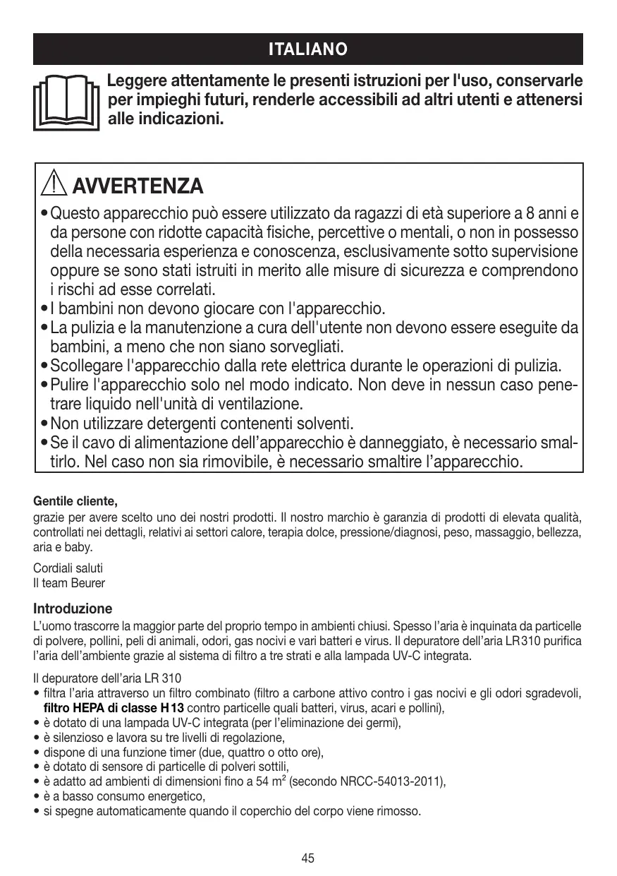 • Questo apparecchio può essere utilizzato da ragazzi di età superiore a 8 anni e da persone con ridotte capacità fisiche, percettive o mentali, o non in possesso della necessaria esperienza e conoscenza, esclusivamente sotto supervisione oppure se sono stati istruiti in merito alle misure di sicurezza e comprendono i rischi ad esse correlati. • I bambini non devono giocare con l'apparecchio. • La pulizia e la manutenzione a cura dell'utente non devono essere eseguite da bambini, a meno che non siano sorvegliati. • Scollegare l'apparecchio dalla rete elettrica durante le operazioni di pulizia. • Pulire l'apparecchio solo nel modo indicato. Non deve in nessun caso penetrare liquido nell'unità di ventilazione. • Non utilizzare detergenti contenenti solventi. • Se il cavo di alimentazione dell’apparecchio è danneggiato, è necessario smaltirlo. Nel caso non sia rimovibile, è necessario smaltire l’apparecchio. Gentile cliente, grazie per avere scelto uno dei nostri prodotti. Il nostro marchio è garanzia di prodotti di elevata qualità, controllati nei dettagli, relativi ai settori calore, terapia dolce, pressione/diagnosi, peso, massaggio, b ellezza, aria e baby. Cordiali saluti Il team Beurer