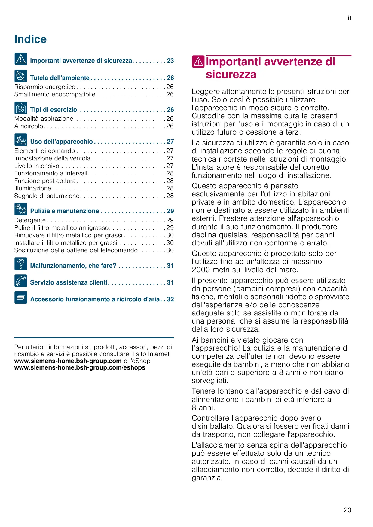 Per ulteriori informazioni su prodotti, accessori, pezzi di ricambio e servizi è possibile consultare il sito Internet www.siemens-home.bsh-group.com e l'eShop www.siemens-home.bsh-group.com/eshops