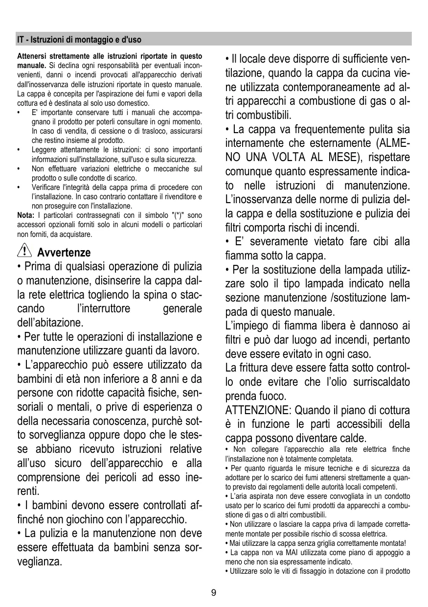 • La pièce doit avoir une aération suffisante lorsque la hotte est utilisée conjointement avec d'autres appareils fonctionnant au gaz ou autres combustibles. • La hotte doit être régulièrement nettoyée à la fois à l'intérieur et à l'extérieur (AU MOINS UNE FOIS PAR MOIS); cela devrait se faire en conformité avec les instructions d'entretien. Le non respect des instructions expressément fournies concernant le nettoyage de la hotte et des filtres peut provoquer des risques d'incendie. • Ne pas flamber d’aliments sous la hotte. • Pour le remplacement de la lampe, utilisez uniquement le type de lampe spécifié dans la section remplacement/maintenance lampe dans ce manuel. L'utilisation d'une flamme nue est dommageable pour les filtres et peut causer un incendie, par conséquent, il est déconseillé de l'utiliser. La friture doit être faite avec soin afin de s’assurer que l’huile surchauffée ne prenne pas feu. AVERTISSEMENT: Lorsque la table de cuisson est en fonctionnement, les parties accessibles de la hotte peuvent devenir très chaudes.