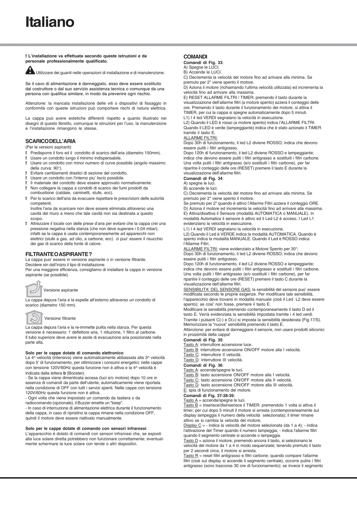 - In caso di interrupzione di alimentazione elettrica durante il funzionamento della cappa, in caso di ripristino la cappa rimane nella condizione OFF, quando il motore deve essere riattivato manually.