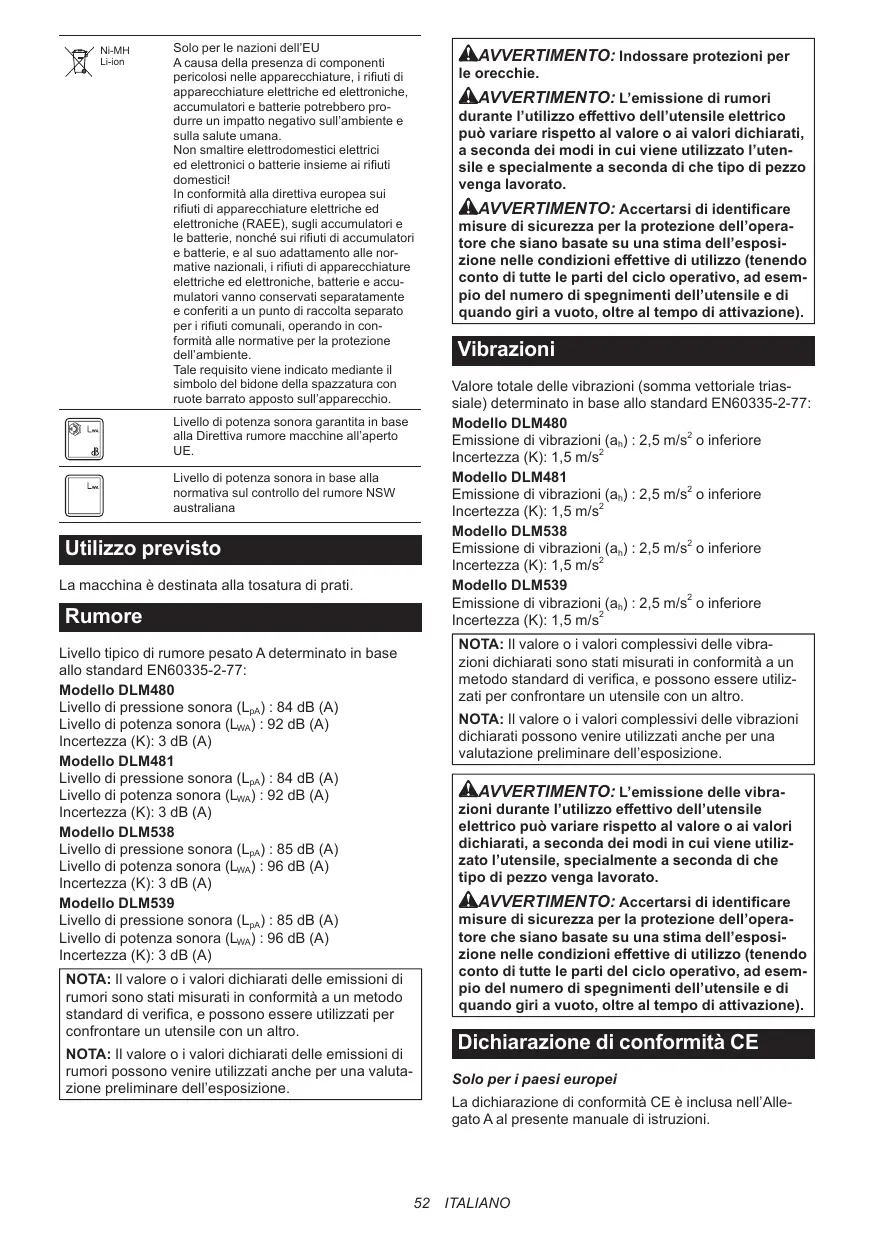 55014-1:2021, EN IEC 55014-2:2021, EN IEC 63000:2018. The conformity assessment procedure required by Directive 2000/14/EC was in accordance with Annex VI. Model DLM480, DLM481 60335-1:2012+A11:2014+A13:2017, EN 60335-2-77:2010, EN 62841-1:2015 Annexe K, EN IEC 55014-1:2021, EN IEC 55014-2:2021, EN IEC 63000:2018. La procédure d’évaluation de la conformité requise par la Directive 2000/14/EC a été réalisée en conformité avec l’Annexe VI. Modèle DLM480, DLM481 - Niveau de puissance acoustique mesuré : 92,6 dB(A), - Niveau de puissance acoustique garanti : 95 dB(A). 55014-2:2021, EN IEC 63000:2018. La procedura di determinazione della conformità richiesta dalla Direttiva 2000/14/EC è st a t a e se g u i t a co n f o r m e m e n t e all’Allegato VI. Modello DLM480, DLM481 - Livello di potenza sonora misurato: 92,6 dB(A), EN 60335-1:2012+A11:2014+A13:2017, EN 60335-2-77:2010, EN 62841-1:2015 Aanhangsel K, EN IEC 55014-1:2021, EN IEC 55014-2:2021, EN IEC 63000:2018. De conformiteitsbeoordelingsprocedure vereist door Richtlijn 2000/14/EC was in overeenstemming met Aanhangsel VI. Model DLM480, DLM481 - Gemeten geluidsvermogenniveau: 55014-2:2021, EN IEC 63000:2018. O procedimento de avaliação da conformidade exigido pela Diretiva 2000/14/EC estava conforme o anexo VI. Modelo DLM480, DLM481 - Nível de potência sonora medido: 55014-2:2021, EN IEC 63000:2018. El procedimiento de valoración de conformidad requerido por la Directiva 2000/14/EC h a si d o r e a l i za d o d e a cu e r d o co n e l Anexo VI. Modelo DLM480, DLM481 - Nivel de potencia de sonido medido: