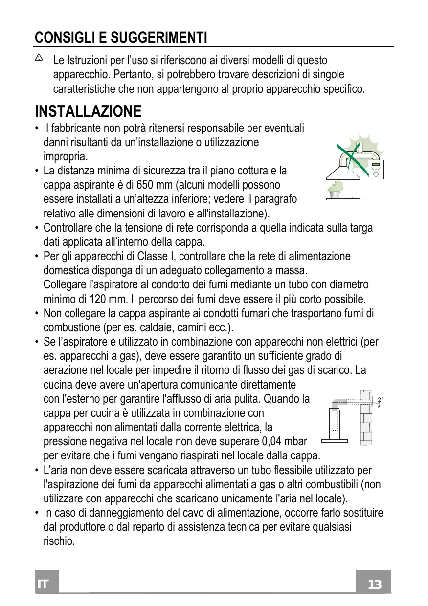 CONSIGLI E SUGGERIMENTI Le Istruzioni per l’uso si riferiscono ai diversi modelli di questo apparecchio. Pertanto, si potrebbero trovare descrizioni di singole caratteristiche che non appartengono al proprio apparecchio specifico. • La distance de sécurité minimum entre le plan de cuisson et la hotte aspirante est de 650 mm (certains modèles peuvent être installés à une hauteur inférieure ; voir le paragraphe concernant les dimensions de travail et l’installation). • Assurez-vous que la tension de votre secteur correspond à celle indiquée sur la plaque des données appliquée à l’intérieur de la hotte. • Pour les appareils de Classe I, s’assurer que l’installation électrique de votre intérieur dispose d’une mise à la terre adéquate. Relier l’aspirateur au conduit de cheminée avec un tube d’un diamètre minimum de 120 mm. Le parcours des fumées doit être le plus court possible. • Ne pas relier la hotte aspirante aux conduits de cheminée qui 2° acheminent les fumées de combustion (par exemple de chaudières, de cheminées, etc.). • Si vous utilisez l’aspirateur en combinaison avec des appareils non électriques (par ex. appareils à gaz), vous devez garantir un degré d’aération suffisant dans la pièce, afin d’empêcher le retour du flux des gaz de sortie. La cuisine doit présenter une ouverture communiquant directement vers l’extérieur pour garantir l’amenée d’air propre. Si vous utilisez la hotte de cuisine en combinaison avec des appareils non alimentés à l’électricité, la pression négative dans la pièce ne doit pas dépasser 0,04 mbar afin d’éviter que la hotte ne réaspire les fumées dans la pièce. • Ne pas évacuer l’air à travers un tube flexible utilisé pour l’aspiration des fumées des appareils alimentés au gaz ou avec d’autres combustibles (ne pas utiliser avec des appareils ayant une seule sortie d’air dans la pièce). • Si le cordon d’alimentation est endommagé, veuillez le faire remplacer par le fabricant ou par un service après-vente agréé pour éviter tout risque d’accident.