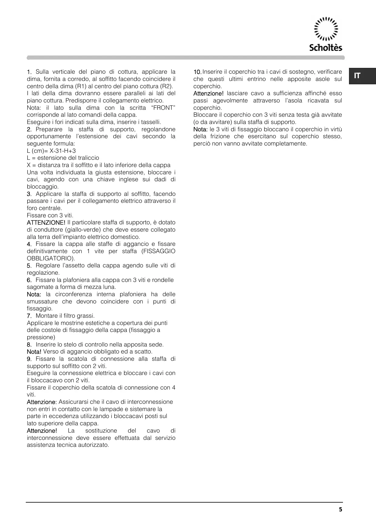 Percez les orifices indiqués sur le gabarit, insérez les chevilles. 2. Préparez le support de fixation en réglant de façon opportune l'extension des câbles selon la formule suivante : L (cm)= X-31-H+3 L = extension de la structure de support X = distance entre le plafond et le côté inférieur de la hotte Dès que vous avez déterminé l'extension correcte, bloquez les câbles en intervenant à l'aide d'une clé anglaise sur les écrous de blocage. 3. Placez le support de fixation contre le plafond en faisant passer les câbles de branchement électrique à travers l'orifice central. Fixez à l'aide de 3 vis. ATTENTION ! L'élément support de fixation est doté d'un conducteur (jaune-vert) qui doit être relié à la terre de l'installation électrique de l'habitation. 4. Fixez la hotte au support de fixation et fixez définitivement à l'aide de 1 vis pour support (FIXATION OBLIGATOIRE). 5. Réglez la position de la hotte en intervenant sur les vis de réglage. 6 Fixez l'éclairage du plan de cuisson à la hotte à l'aide de 3 vis et de rondelles demi-lune. Remarque : la circonférence interne du plafonnier présente des chanfreinages qui doivent coïncider avec les points de fixation. 7. Montez le filtre à graisse. Appliquez les bordures de façon à recouvrir les points des nervures de fixation de la hotte (fixation à pression). Attention ! Sens d'accrochage obligatoire par encliquetage. 8. Introduisez la tige de commande dans le logement prévu à cet effet. Attention ! Sens d'accrochage obligatoire par encliquetage. 9. Fixez le bornier au support de fixation sur le plafond, à l'aide de 2 vis. Effectuez le branchement électrique et bloquez les câbles à l'aide du serre-câble au moyen de 2 vis. Fixez le couvercle du bornier à l'aide de 4 vis. Attention !: Contrôlez que le câble d'interconnexion n'entre pas en contact avec les ampoules ; bloquez la partie excédentaire à l'aide du serre-câble situé sur la partie supérieure de la hotte.