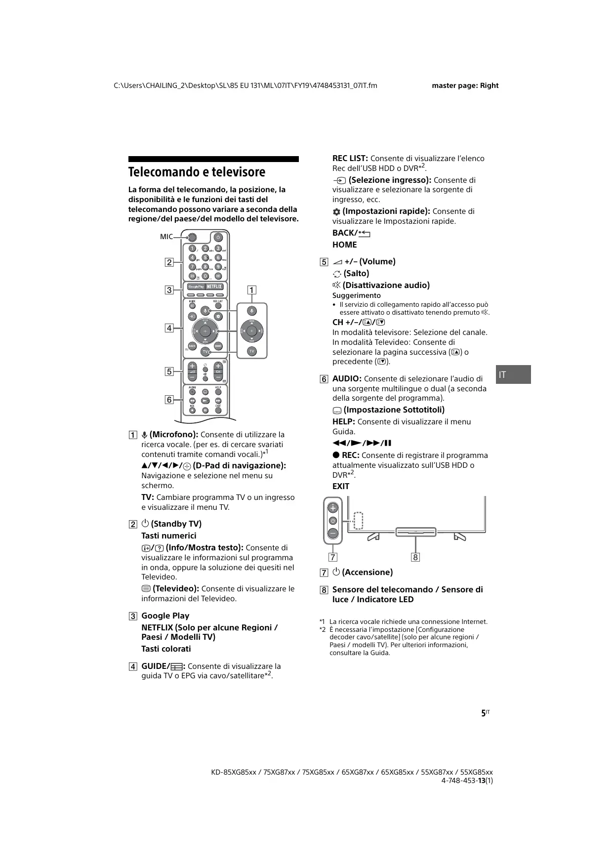 visualizzare le informazioni sul programma in onda, oppure la soluzione dei quesiti nel Televideo. (Accensione) (Televideo): Consente di visualizzare le Sensore del telecomando / Sensore di informazioni del Televideo. Google Play NETFLIX (Solo per alcune Regioni / Paesi / Modelli TV) Tasti colorati luce / Indicatore LED *1 La ricerca vocale richiede una connessione Internet. *2 È necessaria l’impostazione [Configurazione decoder cavo/satellite] (solo per alcune regioni / Paesi / modelli TV). Per ulteriori informazioni, consultare la Guida. GUIDE/ : Consente di visualizzare la guida TV o EPG via cavo/satellitare*2. 5IT KD-85XG85xx / 75XG87xx / 75XG85xx / 65XG87xx / 65XG85xx / 55XG87xx / 55XG85xx 4-748-453-13(1)