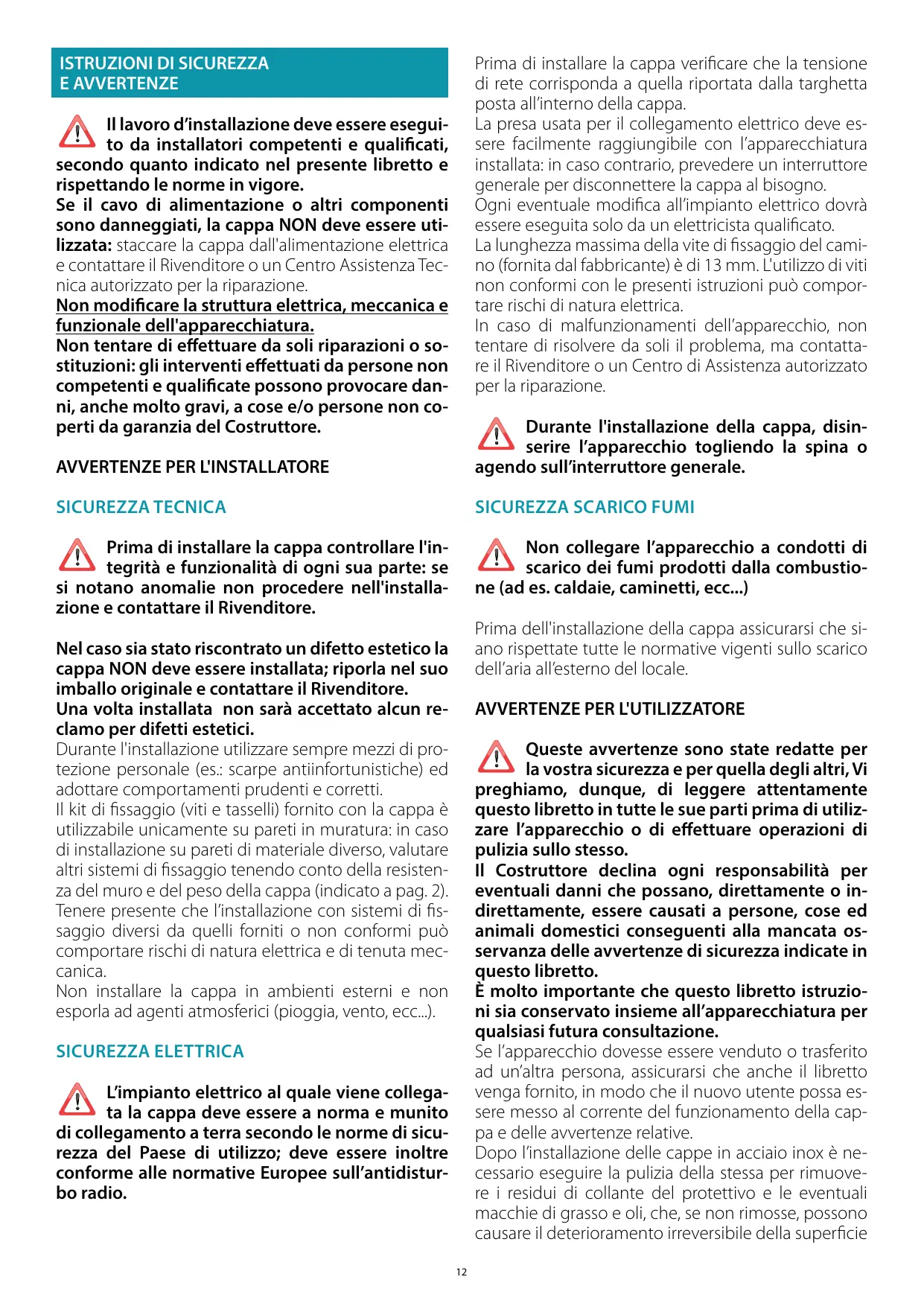 Queste avvertenze sono state redatte per la vostra sicurezza e per quella degli altri, Vi preghiamo, dunque, di leggere attentamente questo libretto in tutte le sue parti prima di utilizzare l’apparecchio o di effettuare operazioni di pulizia sullo stesso. Il Costruttore declina ogni responsabilità per eventuali danni che possano, direttamente o indirettamente, essere causati a persone, cose ed animali domestici conseguenti alla mancata osservanza delle avvertenze di sicurezza indicate in questo libretto. È molto importante che questo libretto istruzioni sia conservato insieme all’apparecchiatura per qualsiasi futura consultazione. Se l’apparecchio dovesse essere venduto o trasferito ad un’altra persona, assicurarsi che anche il libretto venga fornito, in modo che il nuovo utente possa essere messo al corrente del funzionamento della cappa e delle avvertenze relative. Dopo l’installazione delle cappe in acciaio inox è necessario eseguire la pulizia della stessa per rimuovere i residui di collante del protettivo e le eventuali macchie di grasso e oli, che, se non rimosse, possono causare il deterioramento irreversibile della superficie SICUREZZA ELETTRICA L’impianto elettrico al quale viene collegata la cappa deve essere a norma e munito di collegamento a terra secondo le norme di sicurezza del Paese di utilizzo; deve essere inoltre conforme alle normative Europee sull’antidisturbo radio.