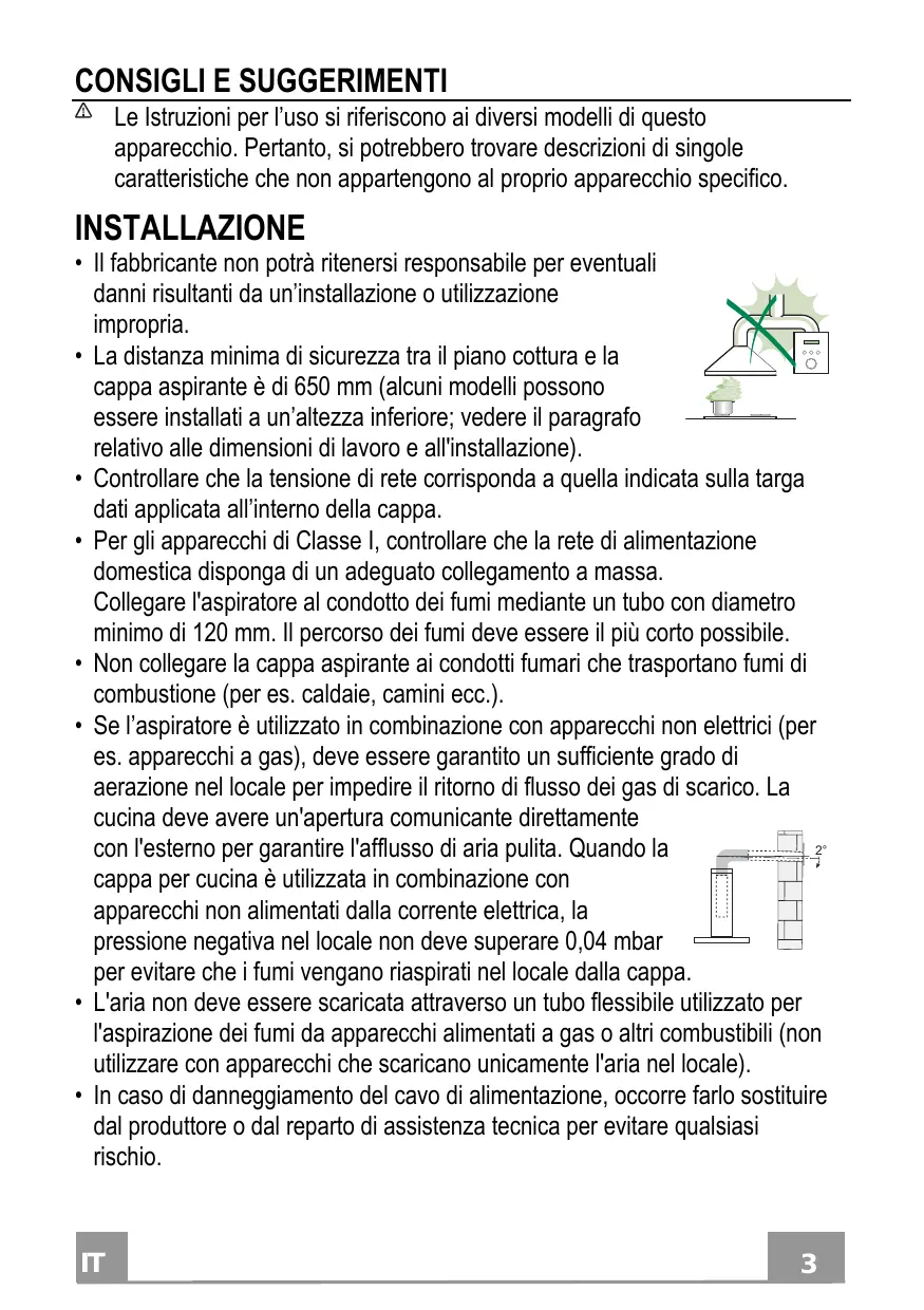 • La distance de sécurité minimum entre le plan de cuisson et la hotte aspirante est de 650 mm (certains modèles peuvent être installés à une hauteur inférieure ; voir le paragraphe concernant les dimensions de travail et l’installation). • Assurez-vous que la tension de votre secteur correspond à celle indiquée sur la plaque des données appliquée à l’intérieur de la hotte. • Pour les appareils de Classe I, s’assurer que l’installation électrique de votre intérieur dispose d’une mise à la terre adéquate. Relier l’aspirateur au conduit de cheminée avec un tube d’un diamètre minimum de 120 mm. Le parcours des fumées doit être le plus court possible. • Ne pas relier la hotte aspirante aux conduits de cheminée qui 2° acheminent les fumées de combustion (par exemple de chaudières, de cheminées, etc.). • Si vous utilisez l’aspirateur en combinaison avec des appareils non électriques (par ex. appareils à gaz), vous devez garantir un degré d’aération suffisant dans la pièce, afin d’empêcher le retour du flux des gaz de sortie. La cuisine doit présenter une ouverture communiquant directement vers l’extérieur pour garantir l’amenée d’air propre. Si vous utilisez la hotte de cuisine en combinaison avec des appareils non alimentés à l’électricité, la pression négative dans la pièce ne doit pas dépasser 0,04 mbar afin d’éviter que la hotte ne réaspire les fumées dans la pièce. • Ne pas évacuer l’air à travers un tube flexible utilisé pour l’aspiration des fumées des appareils alimentés au gaz ou avec d’autres combustibles (ne pas utiliser avec des appareils ayant une seule sortie d’air dans la pièce). • Si le cordon d’alimentation est endommagé, veuillez le faire remplacer par le fabricant ou par un service après-vente agréé pour éviter tout risque d’accident.