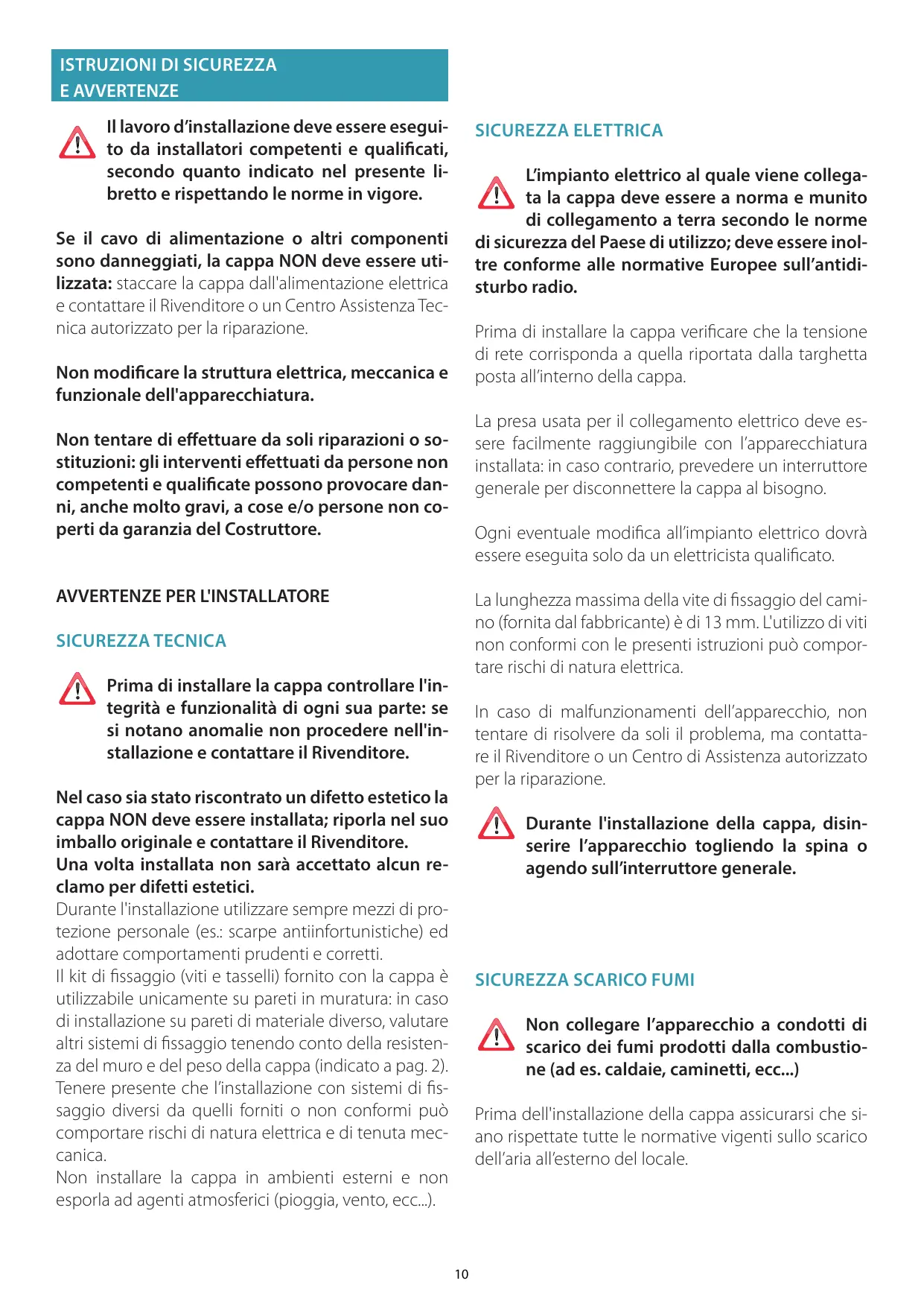 SÉCURITÉ TECHNIQUE Avant d'installer la hotte, contrôler l'intégrité et la fonctionnalité de chaque partie : en cas de constatation d'anomalies, ne pas procéder à l'installation et contacter le Revendeur.