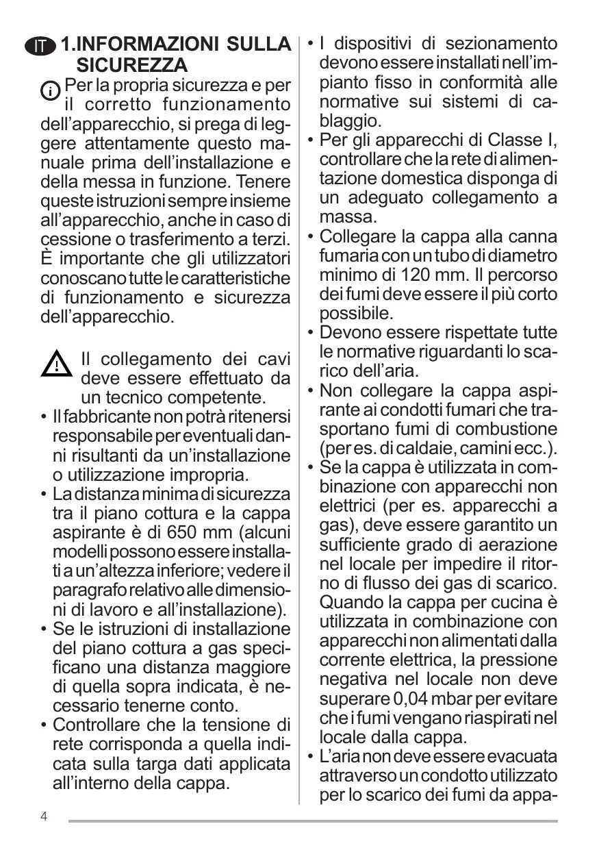 • Pour les appareils de Classe I, s’assurer que l’installation électrique de votre intérieur dispose d’une mise à la terre adéquate. • Reliez l’aspirateur du conduit de cheminée avec un tube ayant un diamètre minimum de 120 mm. Le parcours des fumées doit être le plus court possible. • Respecter toutes les normes concernant l’évacuation de l’air. • Ne reliez pas la hotte aspirante aux conduits de cheminée qui acheminent les fumées de combustion (par ex. de chaudières, de cheminées, etc.). • Si vous utilisez l’aspirateur en même temps que des appareils non électriques (par ex. fonctionnant au gaz), veillez à ce que la pièce soit adéquatement ventilée, afin d’empêcher le retour du flux des gaz d’évacuation. Si vous utilisez la hotte de cuisine en même temps que des appareils non alimentés à l’électricité, la pression négative dans la pièce ne doit pas dépasser 0,04 mbar, afin d’éviter que les fumées soient réaspirées dans la pièce où se trouve la hotte. • Ne pas évacuer l’air à travers une conduite utilisée pour l’évacuation des fumées des appareils de combustion alimentés au gaz ou avec d’autres combustibles.