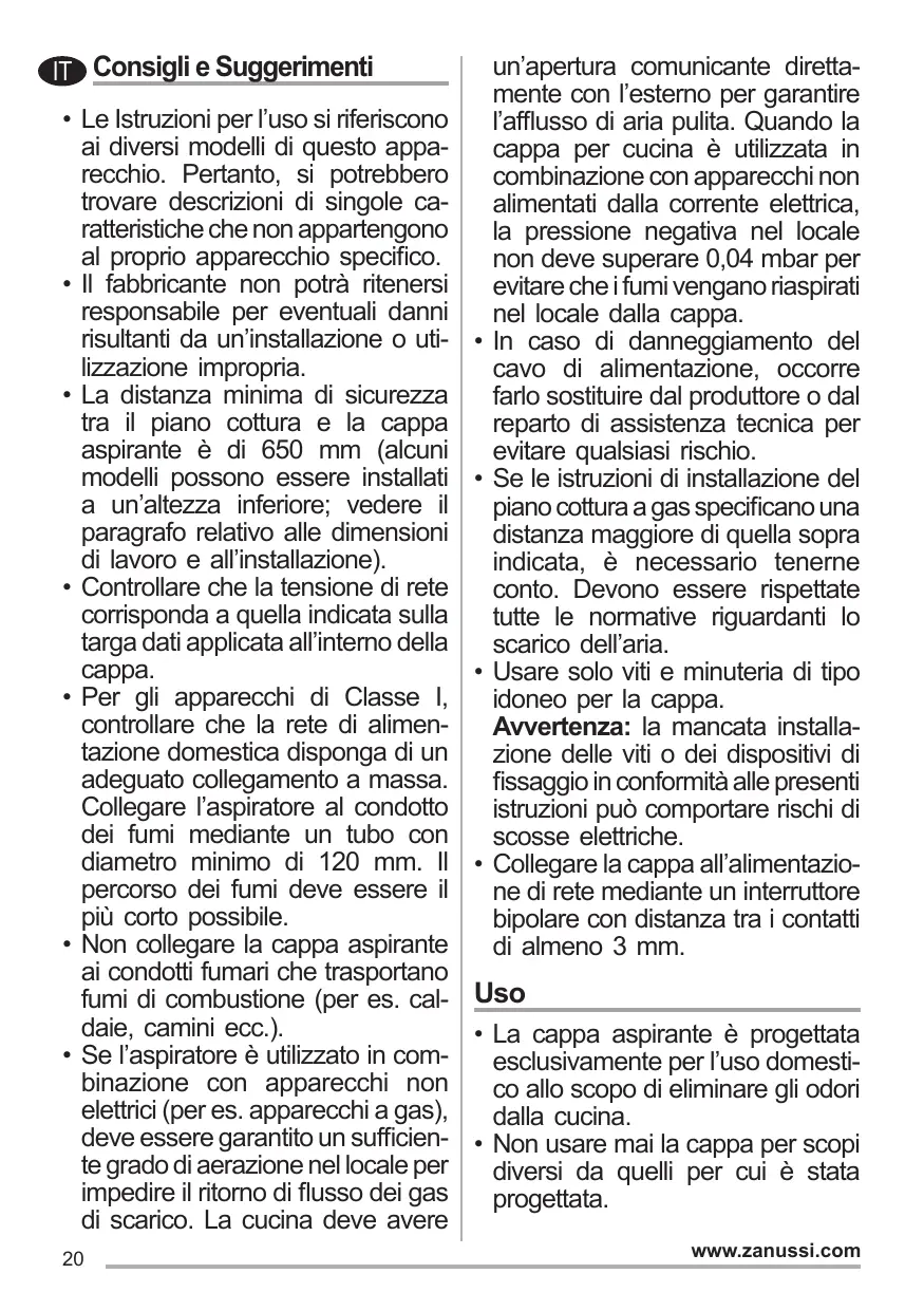 éviter tout risque d’accident. Si les instructions d’installation du plan de cuisson à gaz spécifient une distance supérieure à celle indiquée ci-dessus, veuillez impérativement en tenir compte. Toutes les normes concernant l’évacuation de l’air doivent être respectées. Utiliser exclusivement des vis et des petites pièces du type adapté pour la hotte. Attention: toute installation des vis et des dispositifs de fixation non conforme aux présentes instructions peut entraîner des risques de décharges électriques. Brancher la hotte à l’alimentation de secteur avec un interrupteur bipolaire ayant une ouverture des contacts d’au moins 3 mm. www.zanussi.com