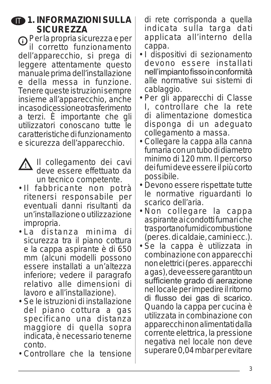 2. UTILISATION de cuisson. • Ne jamais utiliser la hotte pour des objectifs différents de ceux pour lesquels elle a été conçue. • Ne jamais laisser un feu vif allumé sous la hotte lorsque celle-ci est en fonction. • Régler l’intensité du feu de manière à l’orienter exclusivemetnt vers le fond de la casserole, en vous assurant qu’il ne déborde pas sur les côtés. • Contrôler constamment les friteuses durant leur utilisation : l’huile surchauffée risque de s’incendier.