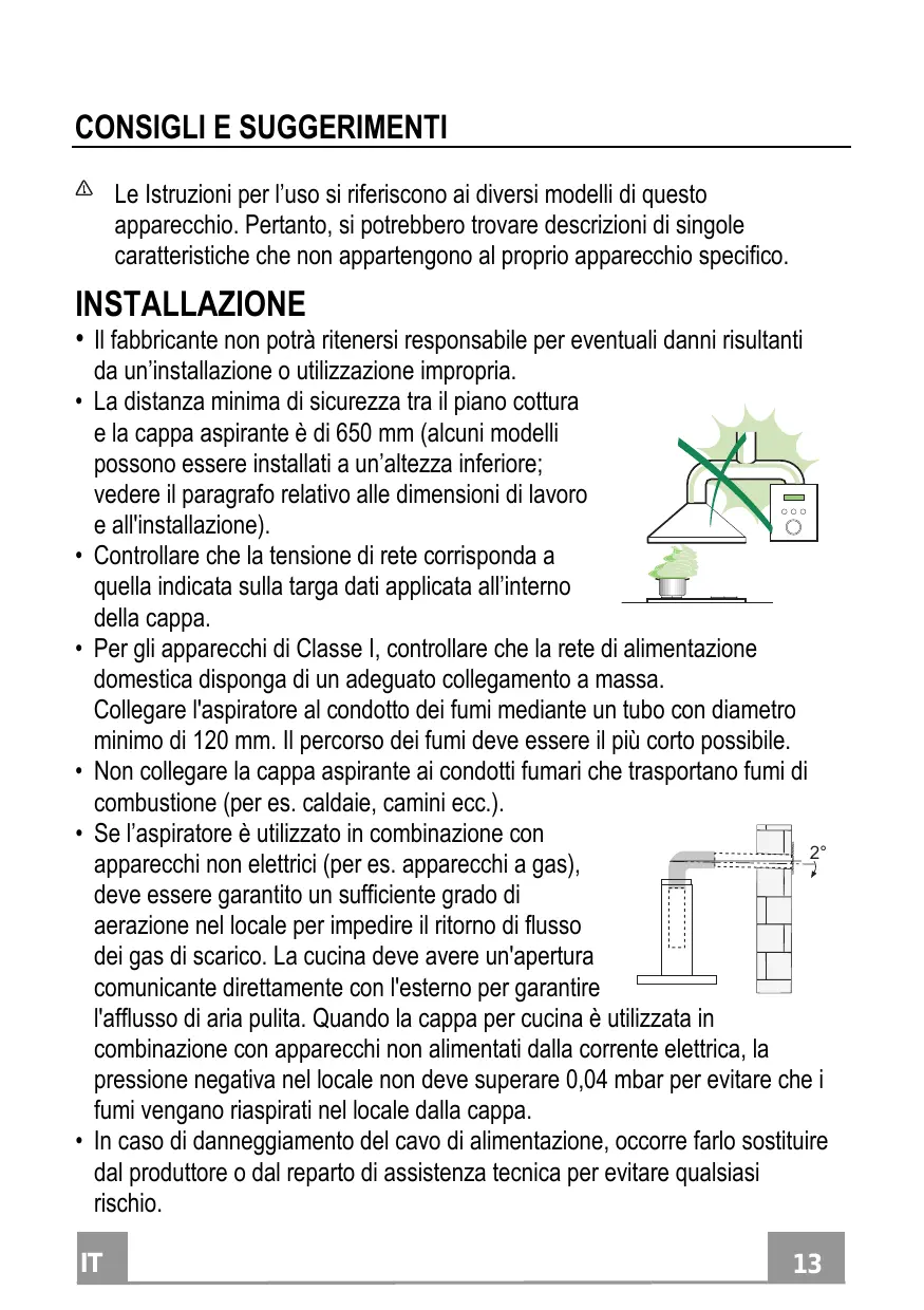 • La distance de sécurité minimum entre le plan de cuisson et la hotte aspirante est de 650 mm (certains modèles peuvent être installés à une hauteur inférieure ; voir le paragraphe concernant les dimensions de travail et l’installation). • Assurez-vous que la tension de votre secteur correspond à celle indiquée sur la plaque des données appliquée à l’intérieur de la hotte. • Pour les appareils de Classe I, s’assurer que l’installation électrique de votre intérieur dispose d’une mise à la terre adéquate. Relier l’aspirateur au conduit de cheminée avec un tube d’un diamètre minimum de 120 mm. Le parcours des fumées doit être le plus court possible. • Ne pas relier la hotte aspirante aux conduits de cheminée qui acheminent les fumées de combustion (par exemple de chaudières, de cheminées, etc.). • Si vous utilisez l’aspirateur en combinaison avec des appareils non électriques (par ex. appareils à gaz), vous 2° devez garantir un degré d’aération suffisant dans la pièce, afin d’empêcher le retour du flux des gaz de sortie. La cuisine doit présenter une ouverture communiquant directement vers l’extérieur pour garantir l’amenée d’air propre. Si vous utilisez la hotte de cuisine en combinaison avec des appareils non alimentés à l’électricité, la pression négative dans la pièce ne doit pas dépasser 0,04 mbar afin d’éviter que la hotte ne réaspire les fumées dans la pièce. • Si le cordon d’alimentation est endommagé, veuillez le faire remplacer par le fabricant ou par un service après-vente agréé pour éviter tout risque d’accident. FR
