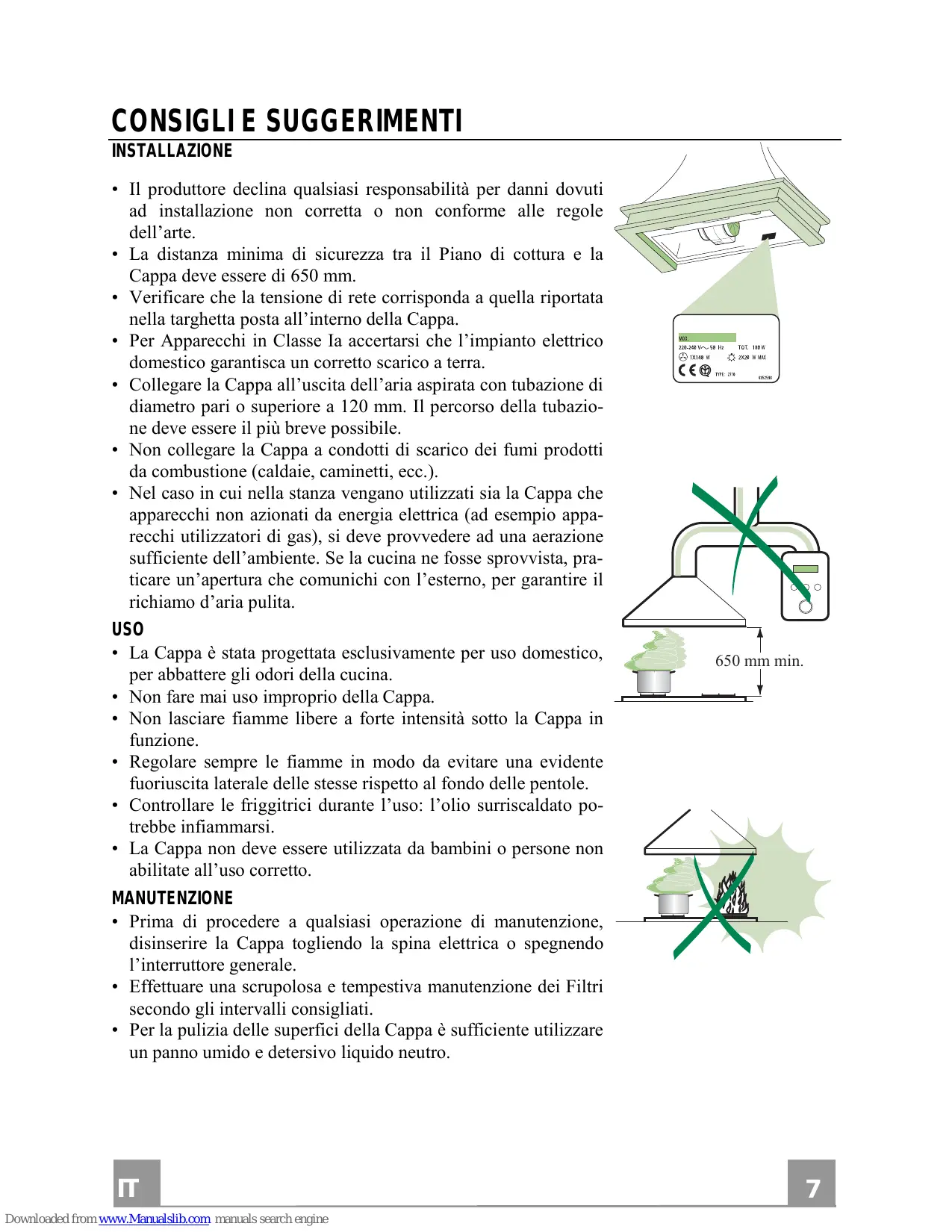 • Ne pas laisser les flammes libres à forte intensité quand la hotte est en service. • Toujours régler les flammes de manière à éviter toute sortie latérale de ces dernières par rapport au fond des marmites. • Contrôler les friteuses lors de l’utilisation car l’huile surchauffée pourrait s’enflammer. • La hotte ne doit pas être utilisée par des enfants ou des personnes ne pouvant pas assurer une utilisation correcte. ENTRETIEN • Avant de procéder à toute opération d’entretien, retirer la hotte en retirant la fiche ou en actionnant l’interrupteur général. • Effectuer un entretien scrupuleux et en temps dû des Filtres, à la cadence conseillée. • Pour le nettoyage des surfaces de la hotte, il suffit d’utiliser un chiffon humide et détersif liquide neutre.