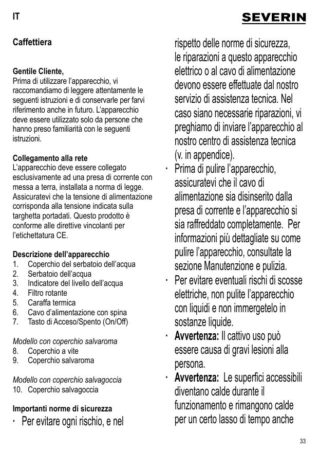Caraffa termica ∙ Per motivi tecnici, la chiusura del coperchio a vite non è ermetica, perciò la caraffa va tenuta sempre in posizione verticale se piena di caffè. ∙ Mantenere il caffè in caldo: una caraffa termica funziona ad accumulo di energia. Per questo motivo è preferibile che la caraffa sia riempita sempre sino alla sua capacità massima. Se viene riempita solo parzialmente, la temperatura non potrà essere mantenuta a livelli ottimali. Se, prima dell’uso, sciacquate la caraffa con acqua calda, potrete mantenere caldo il caffè più a lungo. La caraffa termica è realizzata con doppio vetro isolante di alta qualità e con una camera d’aria fra i due strati per ottenere un maggiore isolamento. Eventuali segni presenti all’interno della caraffa in forma di bolle o di rigature non ne compromettono il funzionamento o la capacità isolante. Se invece sul vetro si evidenziano dei segni di danneggiamento causati dalle ragioni più sotto elencate, c’è il pericolo che il thermos in vetro imploda. L’implosione potrebbe verificarsi anche dopo un certo periodo di tempo dal momento del danno. ∙ Per questo motivo vi raccomandiamo di non bere direttamente dalla caraffa e di non mettere mai le mani nel suo interno. Chiudete sempre la caraffa con il coperchio a vite. Il caffè può essere versato facendo compiere un mezzo giro al coperchio, senza bisogno di rimuoverlo completamente. Non lasciate la caraffa termica incustodita in presenza di bambini. Per evitare danni al thermos: ∙ Evitate che subisca colpi o sbalzi improvvisi di temperatura ∙ Non inserite utensili di nessun tipo per mescolare il contenuto della caraffa. ∙ Non usate spazzole dure o prodotti detergenti abrasivi. ∙ Non usate strofinacci per pulirlo internamente. Delle particelle di polvere potrebbero incrinare il vetro (con un effetto simile a quello del tagliavetro). ∙ Non lavatelo in lavastoviglie. ∙ Non inseritelo nel forno a microonde. Disincrostazione dal calcare ∙ Secondo la qualità dell’acqua (tenore calcareo) della vostra zona nonché la loro frequenza d’utilizzazione, tutti gli apparecchi elettrodomestici termici che utilizzano acqua calda, esigono una periodica disincrostazione (eliminazione dei sedimenti calcarei) destinata a garantirne il buon funzionamento. ∙ Ogni copertura della garanzia sarà annullata e invalidata se i problemi di malfunzionamento dell’apparecchio sono dovuti alla mancata eliminazione dei residui calcarei. ∙ Dei tempi di preparazione più lunghi e un aumento del rumore durante la preparazione, indicano la necessità di procedere alla disincrostazione della caffettiera. ∙ Un eccessivo accumulo di sedimenti calcarei sarà molto difficile da eliminare, anche per mezzo di potenti decalcificanti, potrebbe essere la causa di perdite di acqua del sistema di infusione. Viene perciò altamente raccomandato di procedere alla disincrostazione dell’apparecchio ad intervalli di trenta,