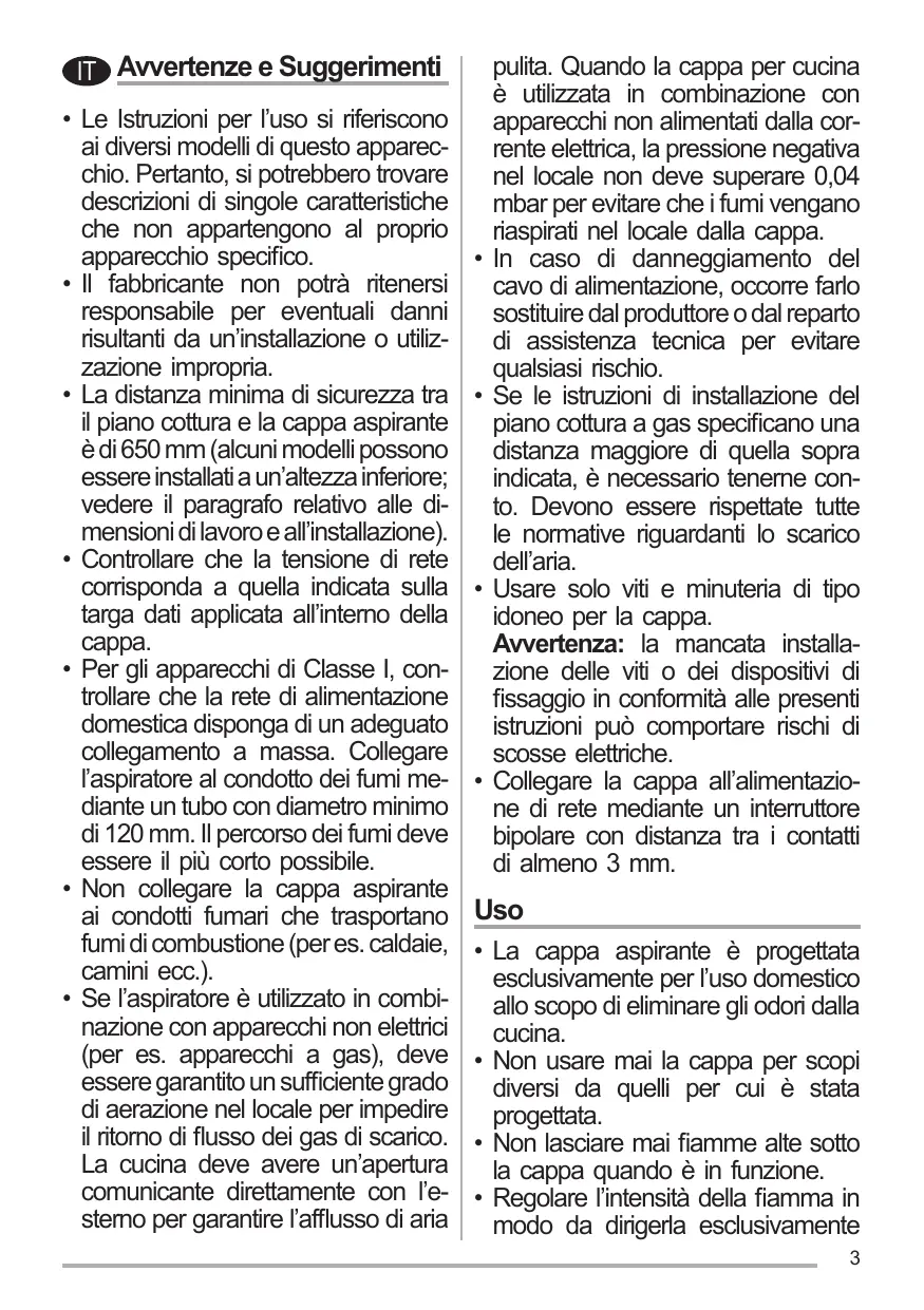 IT Avvertenze e Suggerimenti • Le Istruzioni per l’uso si riferiscono ai diversi modelli di questo apparecchio. Pertanto, si potrebbero trovare descrizioni di singole caratteristiche che non appartengono al proprio apparecchio specifico. • Il fabbricante non potrà ritenersi responsabile per eventuali danni risultanti da un’installazione o utilizzazione impropria. • La distanza minima di sicurezza tra il piano cottura e la cappa aspirante è di 650 mm (alcuni modelli possono essere installati a un’altezza inferiore; vedere il paragrafo relativo alle dimensioni di lavoro e all’installazione). • Controllare che la tensione di rete corrisponda a quella indicata sulla targa dati applicata all’interno della cappa. • Per gli apparecchi di Classe I, controllare che la rete di alimentazione domestica disponga di un adeguato collegamento a massa. Collegare l’aspiratore al condotto dei fumi mediante un tubo con diametro minimo di 120 mm. Il percorso dei fumi deve essere il più corto possibile. • Non collegare la cappa aspirante ai condotti fumari che trasportano fumi di combustione (per es. caldaie, camini ecc.). • Se l’aspiratore è utilizzato in combinazione con apparecchi non elettrici (per es. apparecchi a gas), deve essere garantito un sufficiente grado di aerazione nel locale per impedire il ritorno di flusso dei gas di scarico. La cucina deve avere un’apertura comunicante direttamente con l’esterno per garantire l’afflusso di aria