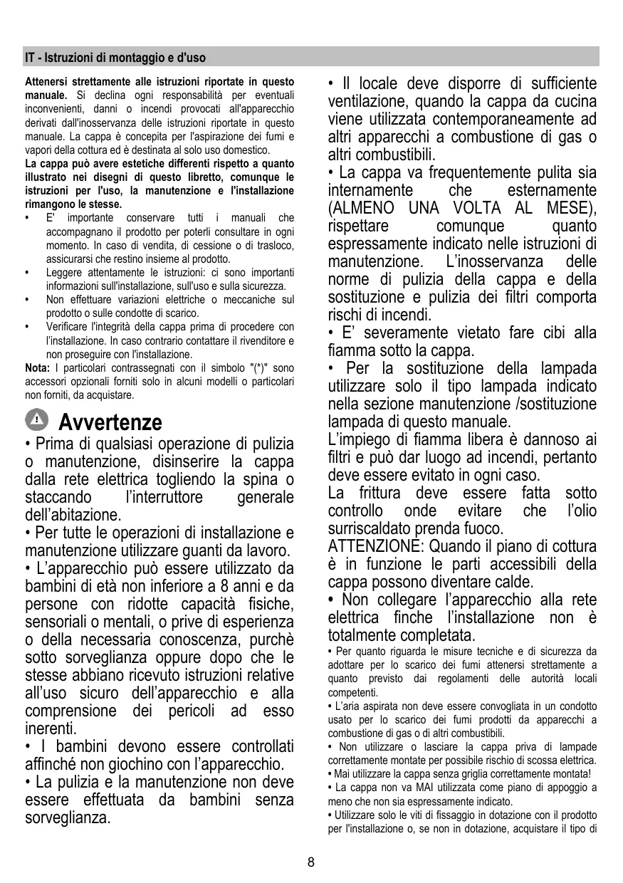 La campana puede ser diferente con respecto a los dibujos de este manual, aunque las instrucciones para su uso, la manutención y la instalación son las mismas. • Es importante guardar este manual para poder consultar si fuera necesario.En el caso de venta,de inutilidad o de mudanza, asegurarse que quede junto al producto. • Leer atentamente las instrucciones:contiene importantes informaciones sobre la instalación,el uso y la seguridad. • No realizar variaciones electricas o mecanicas en el producto o en el tubo de escape. • Antes de instalar el aparato,controlar que todas sus partes no estèn dañadas. En caso contrario llamar al revendedor y no realizar la instalaciòn. Nota: Los elementos que están marcados con el símbolo "(*)" son accesorios opcionales suministrados únicamente con algunos modelos o elementos no suministrados, que deben comprarse a parte.