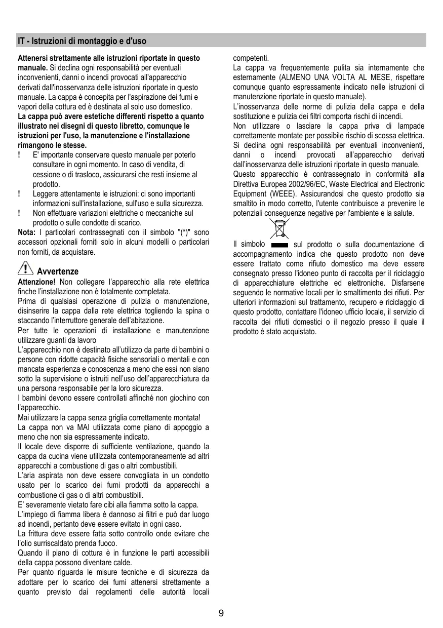 Non utilizzato o lasciare la cappa priva di lampade correttamente montate per possibile rischio di scossa elettrica. Si declina ogni responsabilità per eventuali inconvenienti, danni o incendi provocati all'apparechio derivati dall'inosservanza delle struzioni riportate in quello manuale. Questo apparecchio è contrassegnato in conformità alla Direttiva Europea 2002/96/EC, Waste Electrical and Electronic Equipment (WEEE). Assicurandosi che lo prodotto sa smalito in modo correto, l'utente contribuire a prevenir le potenziali consequences negative per l'ambiente e la salute.
