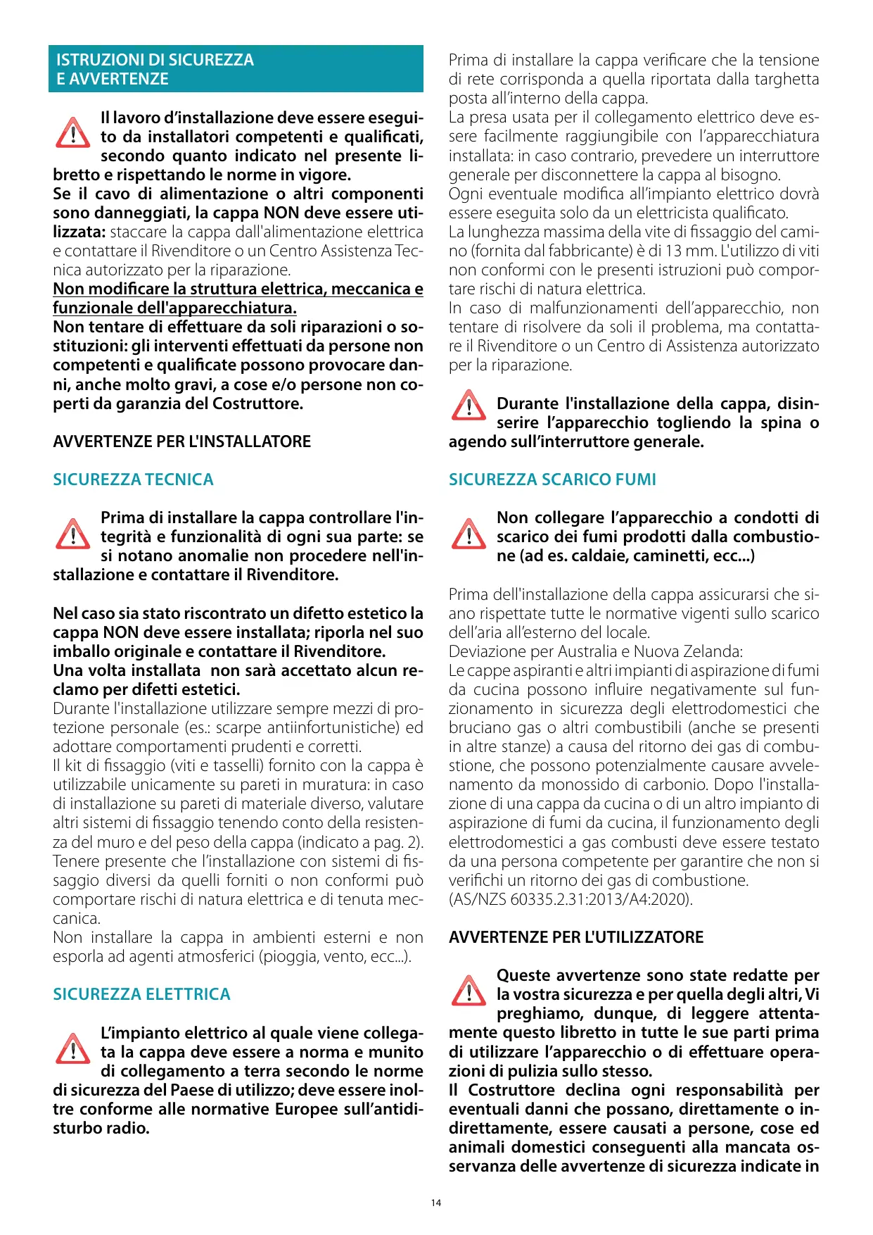 Divergencia normativa para Australia y Nueva Zelanda: Las campanas extractoras y otros extractores de humos de cocina pueden afectar negativamente al funcionamiento seguro de los aparatos que queman gas u otros combustibles (incluidos los que se encuentran en otras habitaciones) debido al reflujo de los gases de combustión. Dichos gases pueden, potencialmente, derivar en intoxicación por monóxido de carbono. Tras la instalación de una campana extractora u otro extractor de humos de cocina, una persona competente debe probar el funcionamiento de los aparatos de gas de combustión para cerciorarse de que no se produzca el reflujo de los mismos. (AS/NZS 60335.2.31:2013/A4:2020). No realice operaciones de limpieza con las partes de la campana aún calientes. Si no se realiza la limpieza según las modalidades y los productos indicados en este manual, esto puede conllevar un riesgo de incendio. Desconecte el interruptor general, si no va a usar el equipo durante un periodo de tiempo prolongado. En caso de utilizar simultáneamente otros equipos (calderas, estufas, hogares, etc.) alimentados con gas o con otros combustibles, prevea una adecuada ventilación del ambiente donde se realiza la aspiración de humos, según las normas vigentes.