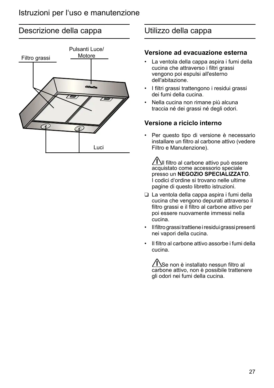 Per questo tipo di versione è necessario installare un filtro al carbone attivo (vedere Filtro e Manutenzione). Il filtro al carbone attivo può essere acquistato come accessorio speciale presso un NEGOZIO SPECIALIZZATO. I codici d‘ordine si trovano nelle ultime pagine di questo libretto istruzioni. ❑ La ventola della cappa aspira i fumi della cucina che vengono depurati attraverso il filtro grassi e il filtro al carbone attivo per poi essere nuovamente immessi nella cucina. Il filtro grassi trattiene i residui grassi presenti nei vapori della cucina. Il filtro al carbone attivo assorbe i fumi della cucina. Se non è installato nessun filtro al carbone attivo, non è possibile trattenere gli odori nei fumi della cucina.