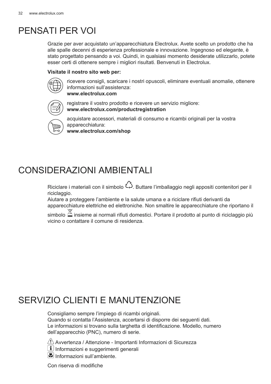 Avant de contacter le service, assurez-vous de disposer des informations suivantes : Vous trouverez ces informations sur la plaque signalétique. Modèle, PNC, numéro de série. Avertissement/Attention : consignes de sécurité. Informations générales et conseils. Informations en matière de protection de l’environnement. Sous réserve de modifications.