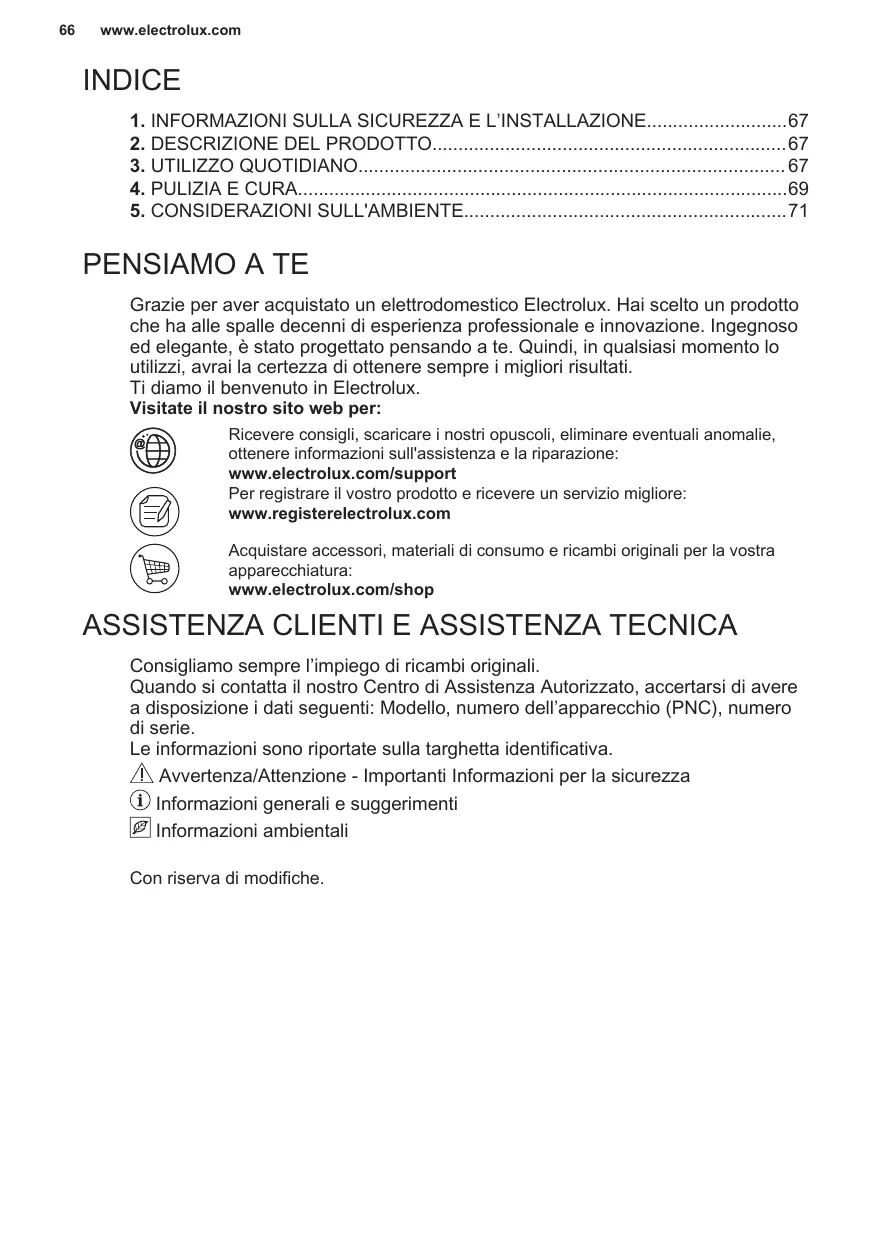 INDICE 1. INFORMAZIONI SULLA SICUREZZA E L’INSTALLAZIONE67 2. DESCRIZIONE DEL PRODOTTO67 3. UTILIZZO QUOTIDIANO 67 4. PULIZIA E CURA69 5. CONSIDERAZIONI SULL'AMBIENTE71